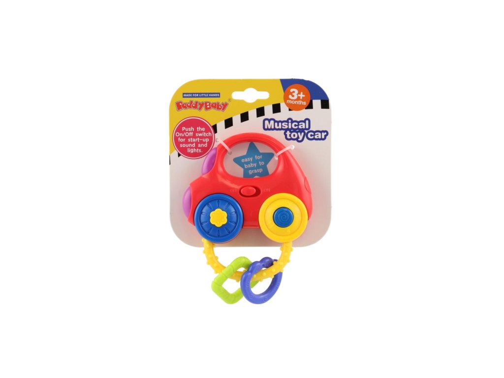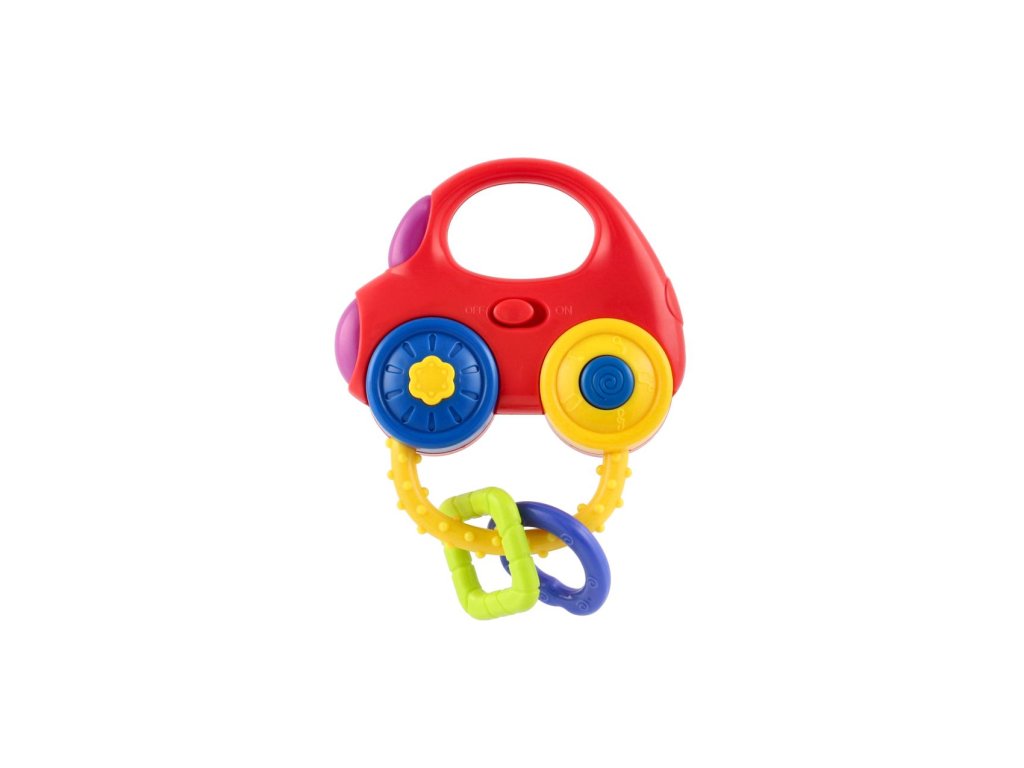 Barevné dětské chrastítko ve tvaru auta se díky svým veselým barvám stane velmi oblíbeným u nejmenších. Chrastítko po zmáčknutí tlačítek bliká, hraje melodie a vydává zvuky startujícího, jedoucího či troubícího auta.Chrastítko je na baterie 2x AG13, které jsou součástí hračky.