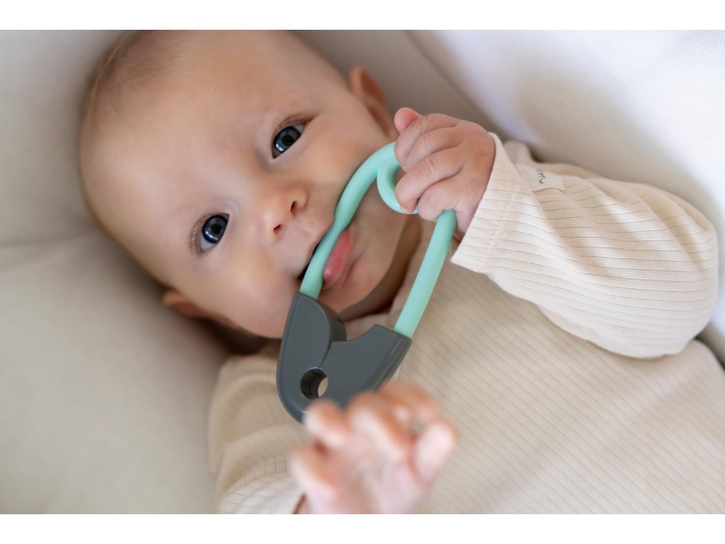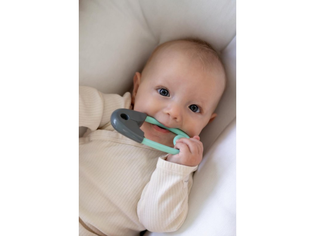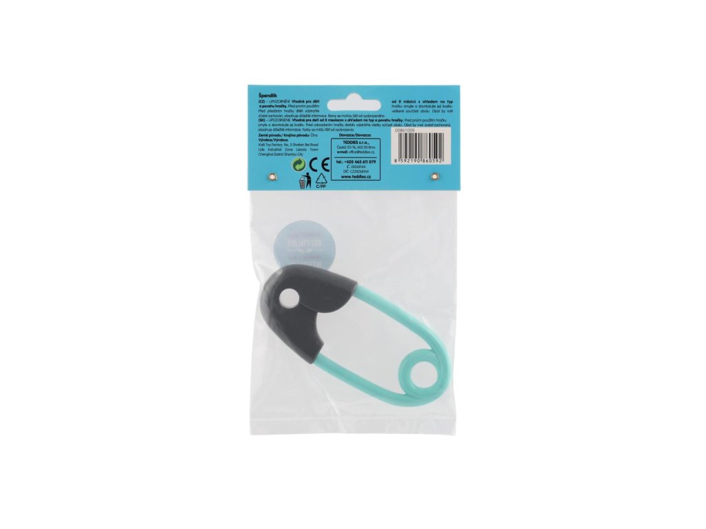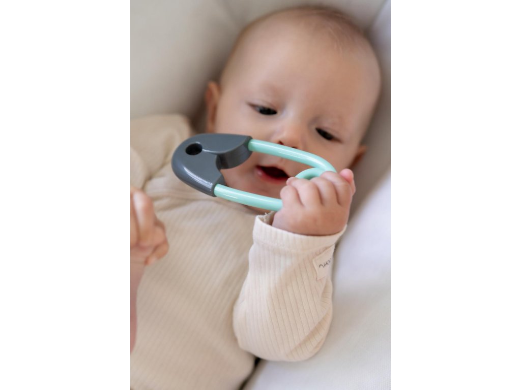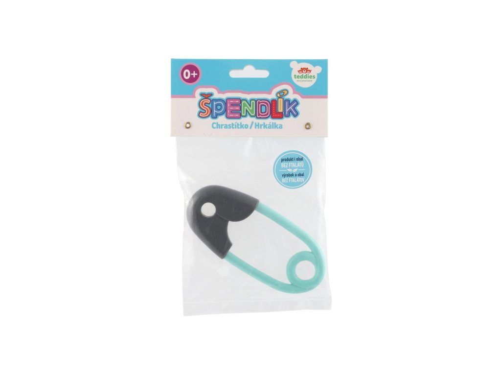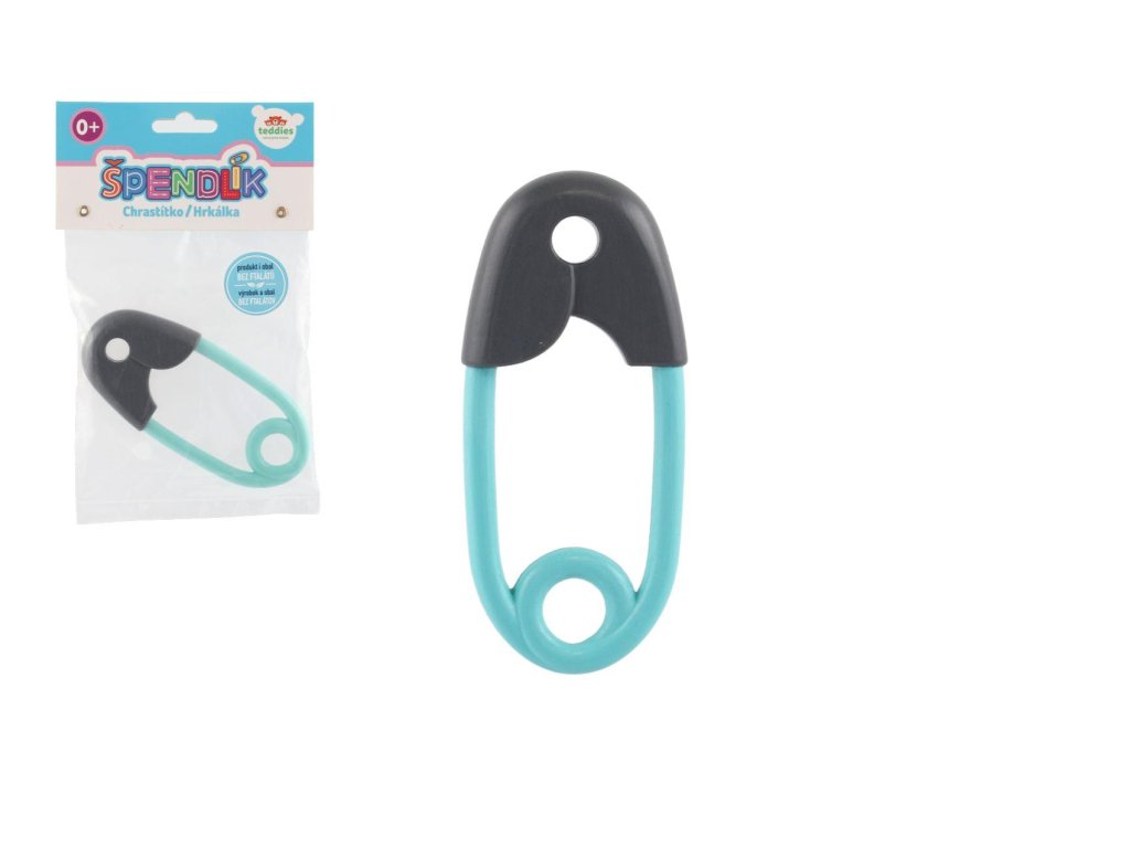 Chrastítko špendlík plast 12cm šedotyrkysové 12x19cm v sáčku 0m+