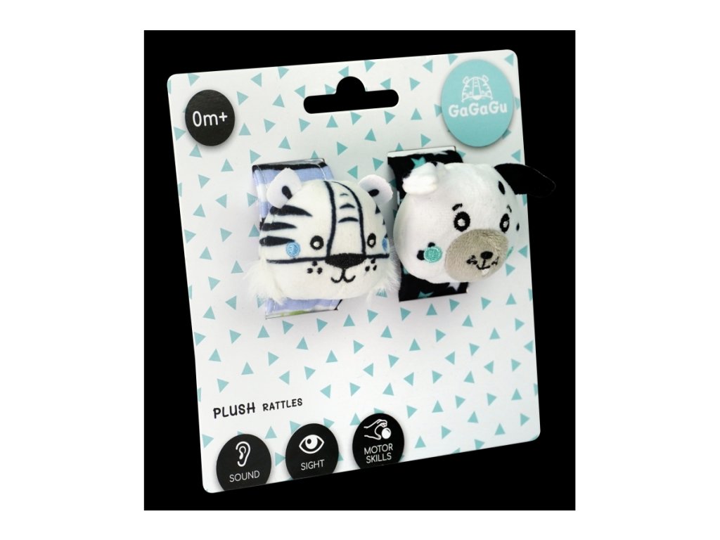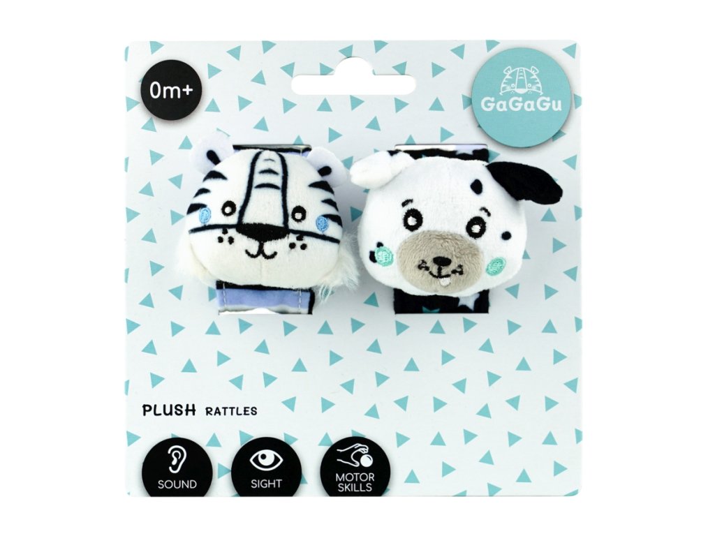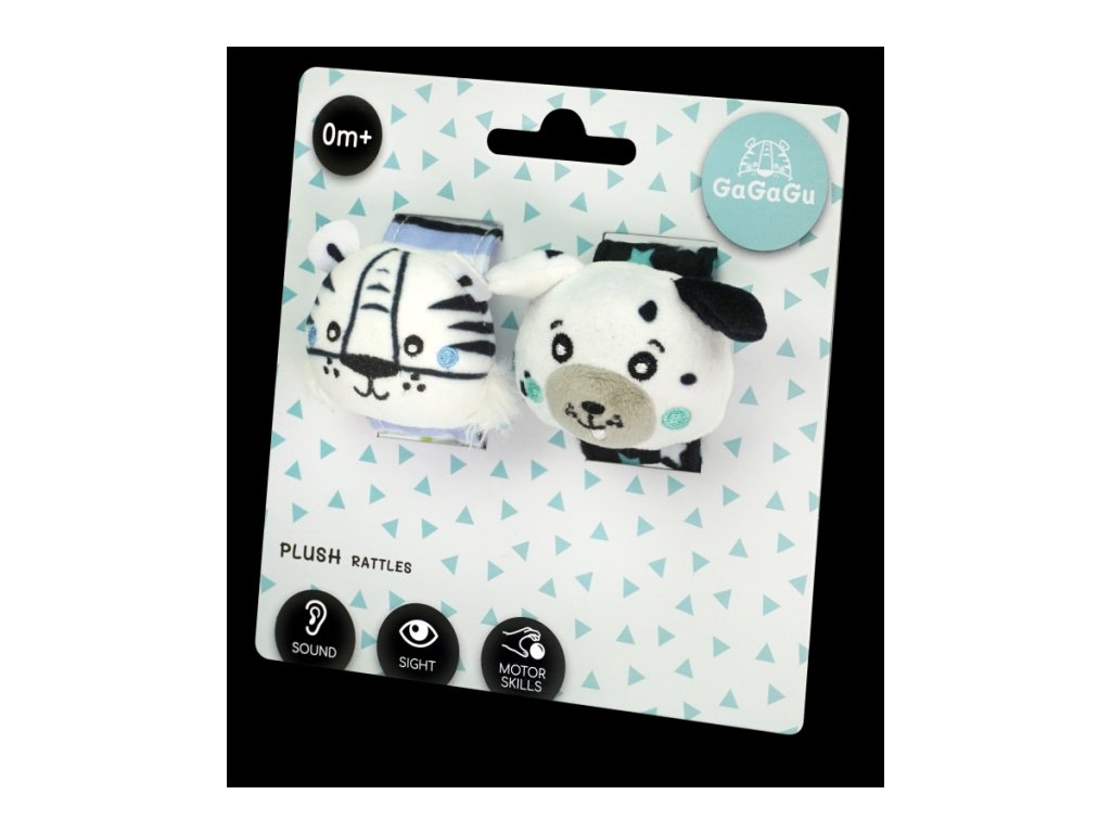 Kdo má uši, ať poslouchá… Jak víme, člověk má pár uší od samého počátku, ale jaké zvuky jsou pro našeho prcka nejvhodnější? Naše chrastítka s plyšovými hlavami tygra a pejska je skvělým řešením, které aktivuje smysly dítěte už od narození.Chrastítko GaGaGu aktivuje sluch – zvuk chrastítek je měkký a příjemný (ne příliš hlasitý). Chrastítko má kontrastní barvy a vzory, které stimulují zrak dítěte. Plyšové hlavy zvířátek – tygra a psa – vybízejí děti k jejich chytání a podporují cvičení tzv jemné motoriky (pohyby prstů a rukou) a učení motorické koordinace. Chrastítko lze připevnit na zápěstí (speciálním suchým zipem, žádné ostré chlupy, lze snadno zapnout) a použít jako běžné chrastítko, protože je popruh vyroben z měkkého materiálu a umožňuje tak dítěti pohodlnému uchopení celé hračky. Věk 0+Doplňkové parametry