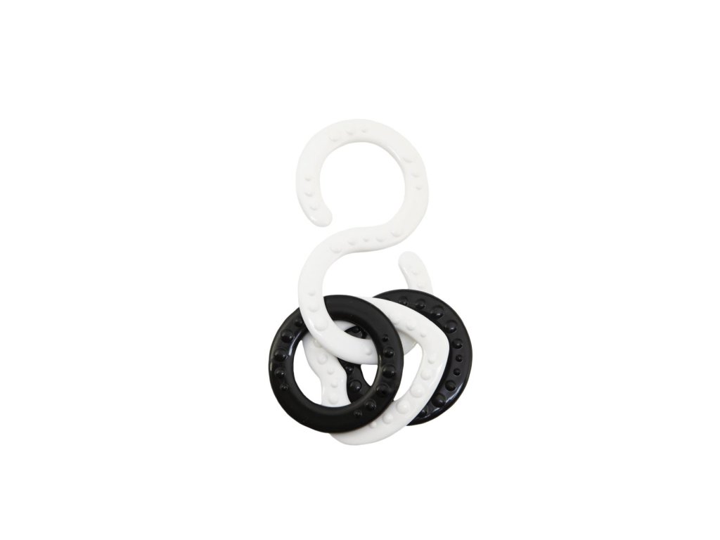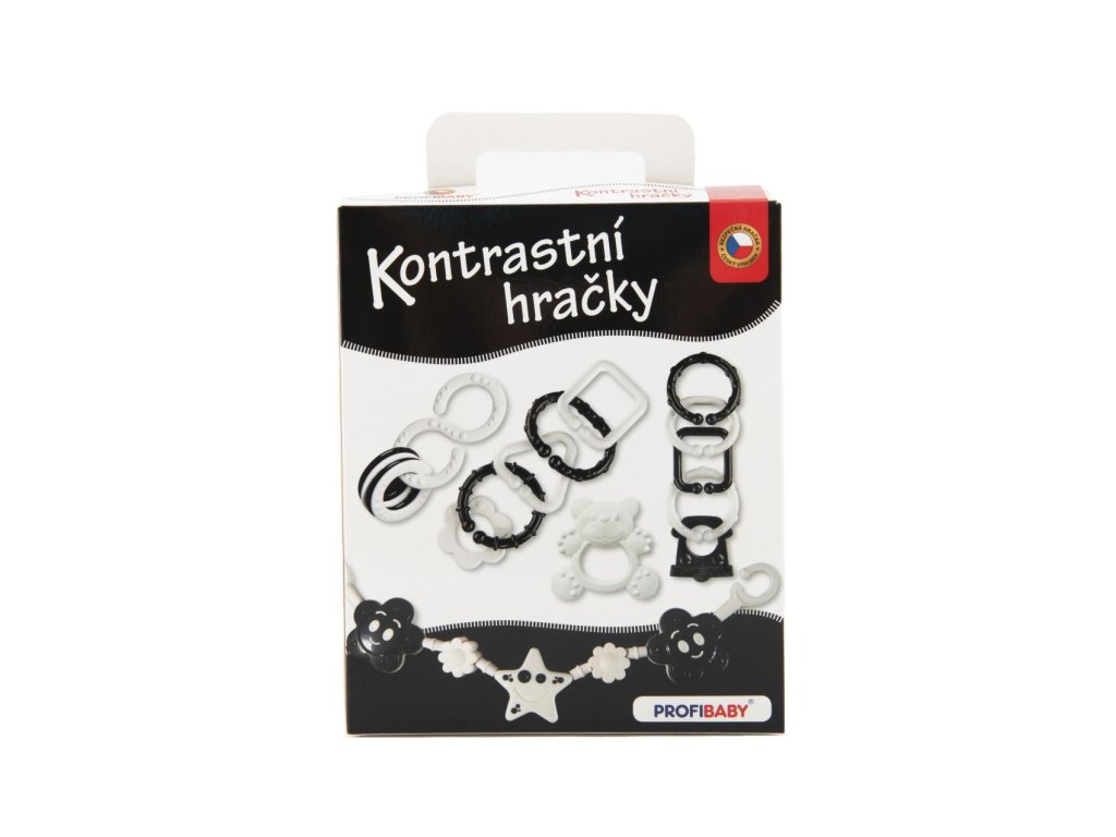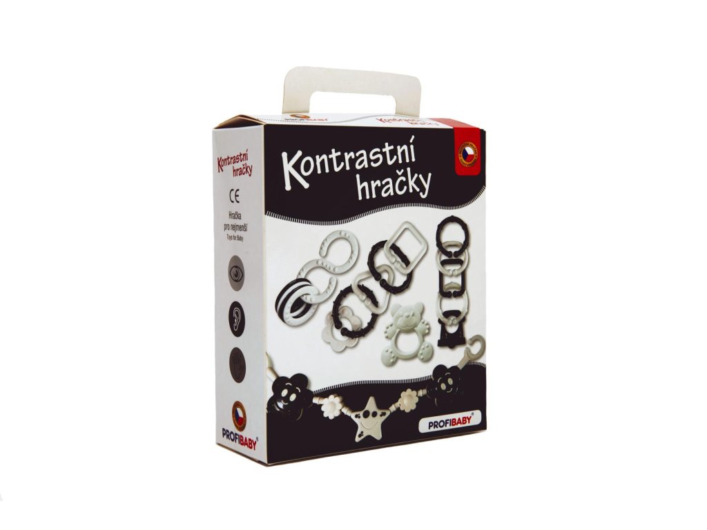 Set kontrastních hraček v dárkové krabičce v černobílém provedení. Tato barevná kombinace dokonale stimuluje smysl zraku u dítěte, které dosud nerozlišuje barvy. Chrastítka jsou tvarově koncipována tak, aby byla snadno uchopitelná dětskou rukou – při hře si dítě zároveň cvičí uchopovací reflex. Samozřejmostí ve výrobě je použití zdravotně nezávadných materiálů, splňujících náročné hygienické normy. Chrastítka jsou stálobarevná, bez ostrých hran, které by mohly dítěti při hře ublížit, a bez uvolnitelných malých částí, u nichž hrozí odlomení a následné případné vdechnutí či spolknutí dítětem.Balení obsahuje 4 výrobky v černobílé kombinaci.Vhodné pro děti od narození