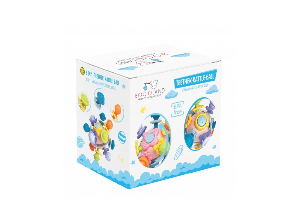 Inovativní senzorická hračka 3v1 – hračka, kousátko a chrastítko – je navržena pro děti od 12 měsíců.