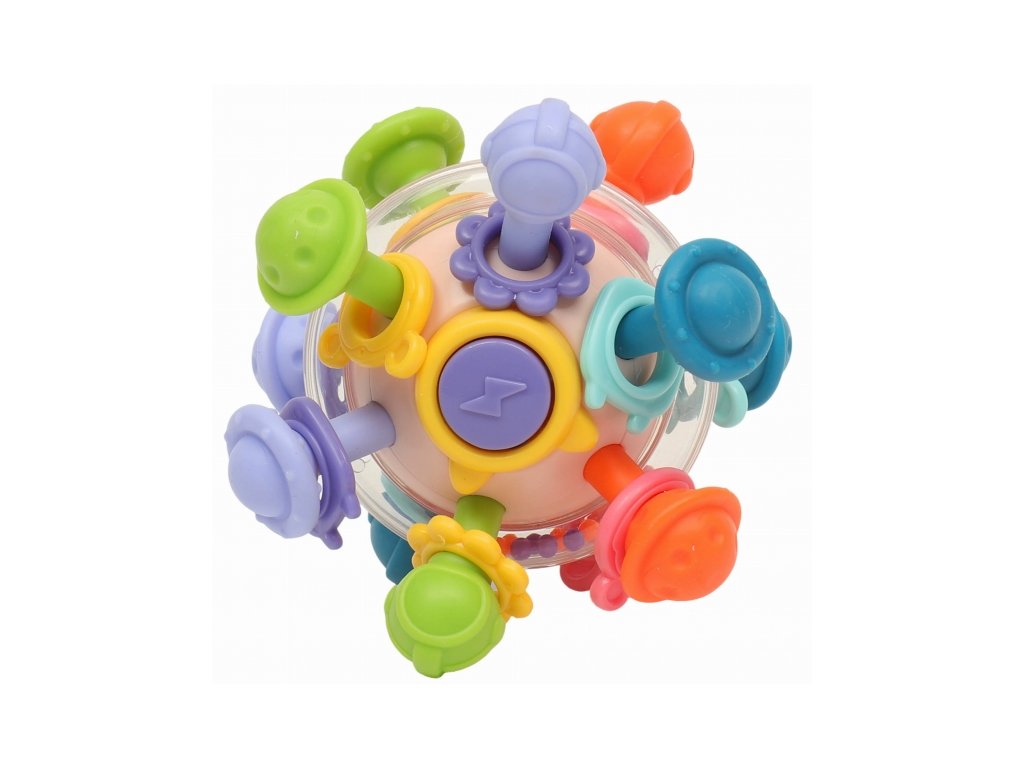 Uprostřed hračky se nachází průhledné chrastítko s drobnými kuličkami.