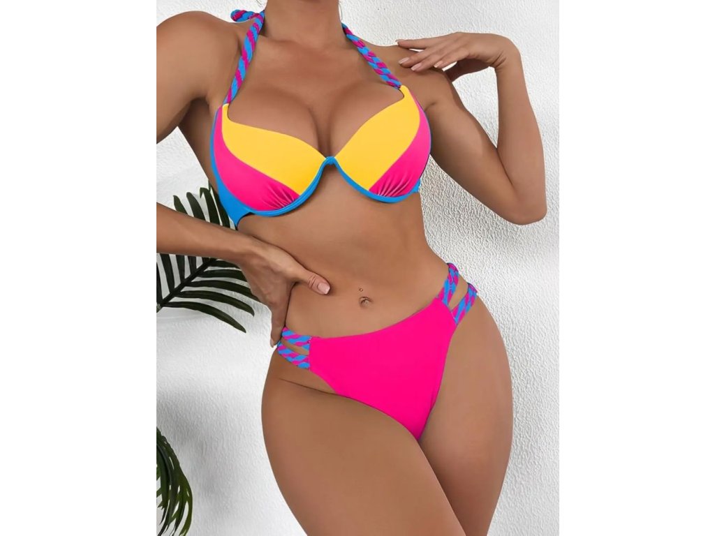 Dámské dvojdílné push-up plavky v nádherných kontrastních barvách (růžovo-zelené, vel. L)