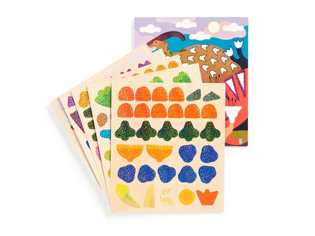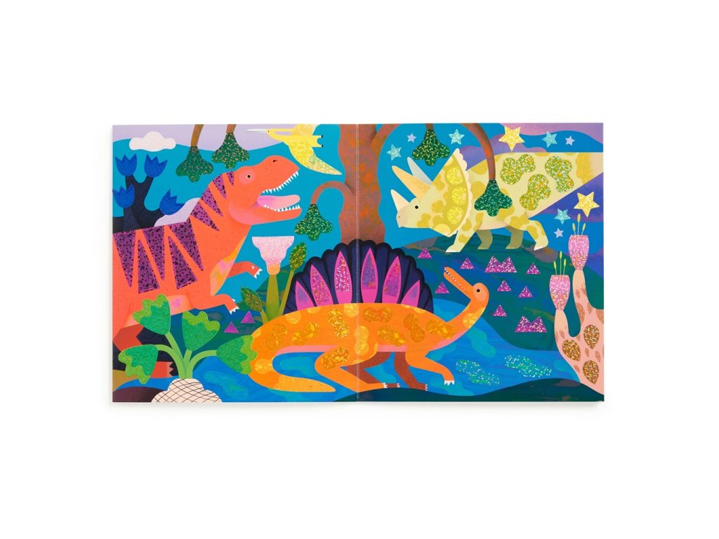 Rozvíjejte fantazii svého dítěte a vydejte se na dobrodružnou cestu do pravěku plnou třpytivých obrázků a zářivých barev! Sada samolepek obsahuje pestrobarevnou scénu prehistorického světa s více než 200 třpytivými holografickými samolepkami.