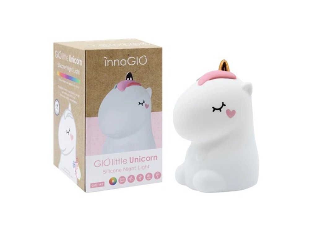 Přenosná silikonová lampička.Noční lampa GIOlittle Unicorn se nabíjí USB-C kabelem. Má vestavěnou baterii, která při plném nabití umožňuje odpojit svítilnu od zdroje energie a přemístit ji na libovolné místo. Plné nabití lampy trvá asi 3 hodiny. Po této době může lampa pracovat bezdrátově v režimu bílého světla až 10 hodin a přibližně 9 hodin v režimu barevného světla.