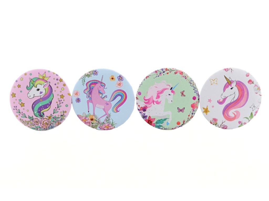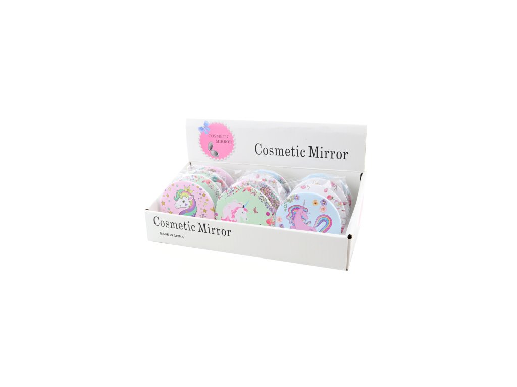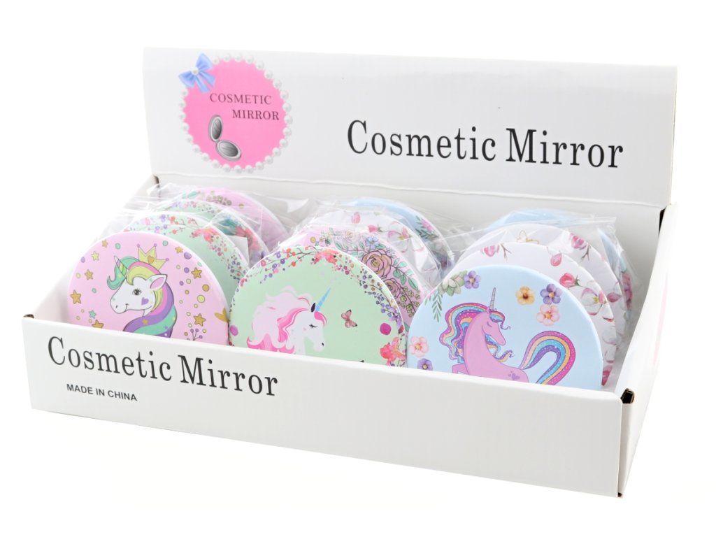 Kulaté zrcátko s motivem jednorožců. Průměr cca 7 cm. Materiál plast. Baleno v sáčku. Více druhů - dodáváme dle skladové dostupnosti. Výrobek není hračka.Doplňkové parametry