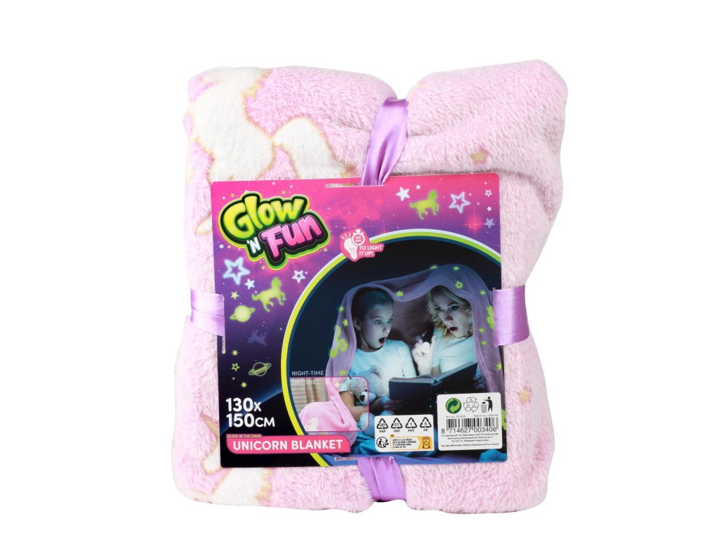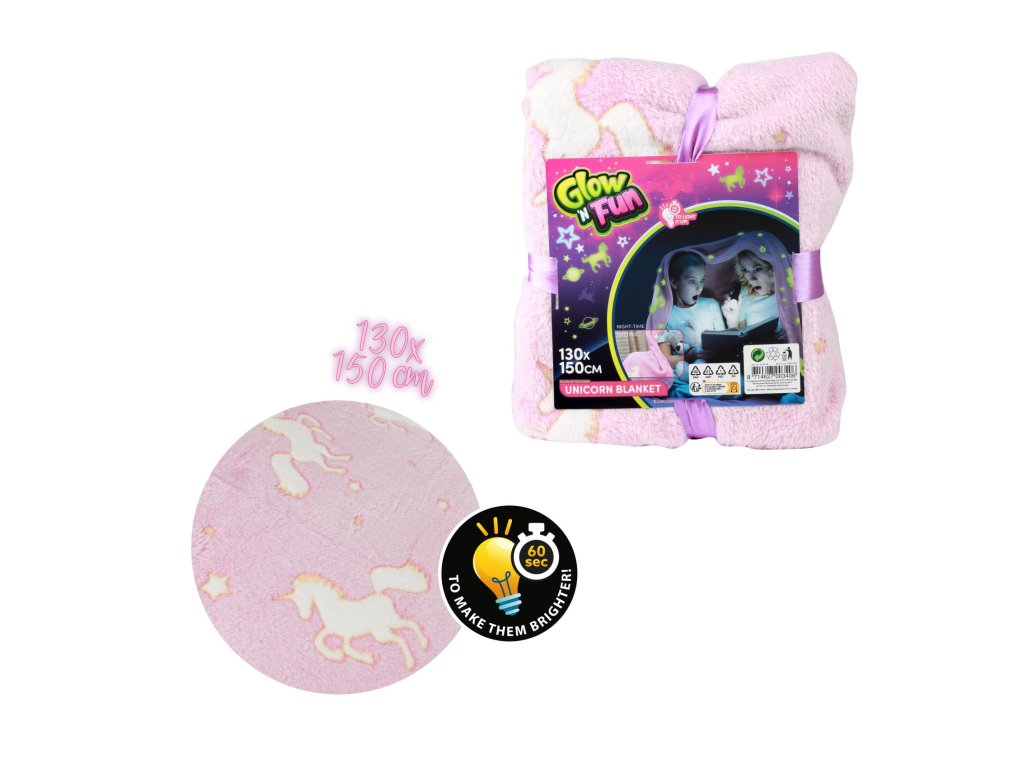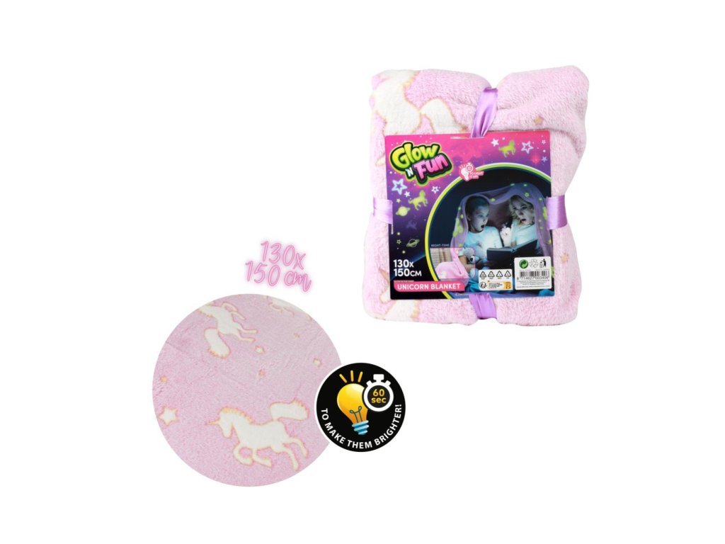 Plyšová deka po nasvícení svítí. Stačí pouhých 60 vteřin pod světlem, ovšem čím bude světlo intenzivnější, tím více a déle bude produkt ve tmě svítit. Doporučujeme nechat na světle „nasvítit“ co nejdéle, minimálně však 10 minut. Deku zdobí jednorožci, hvězdičky, které ve tmě opravdu svítí.Rozměr deky: 130 x 150 cm