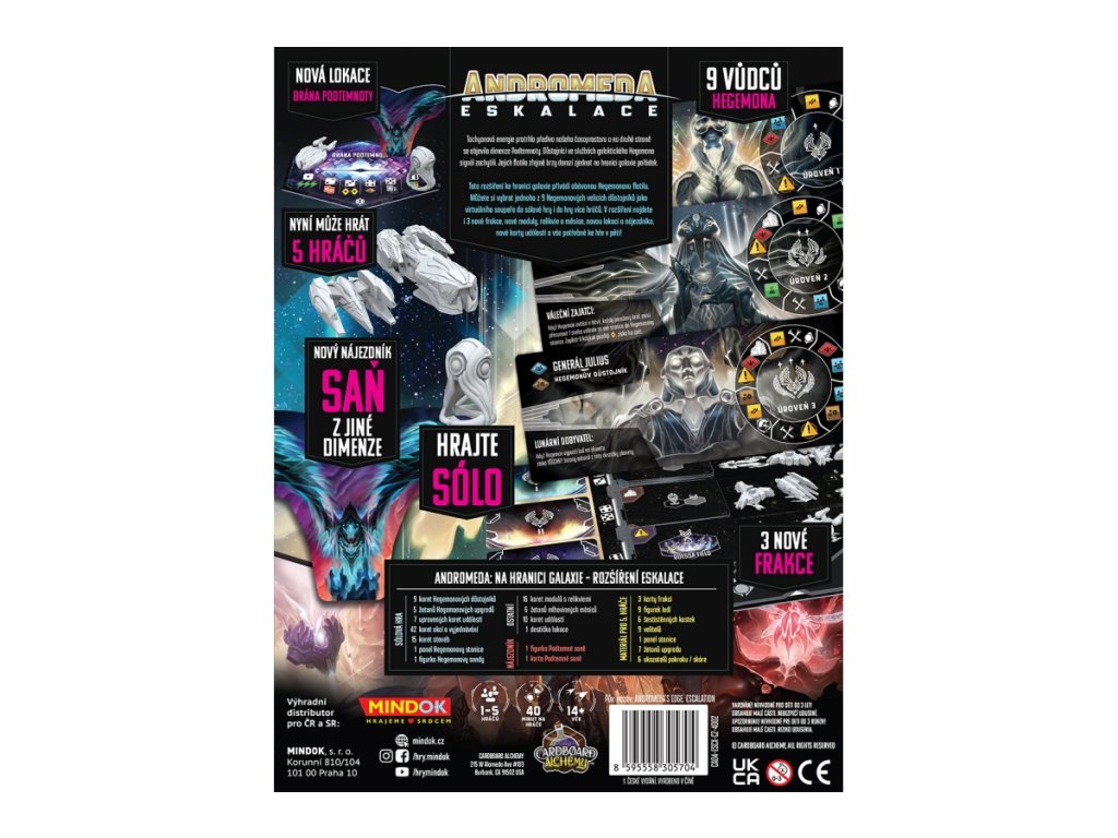 Rozšíření Eskalace přináší do hry Andromeda nové prvky a rozšiřuje možnosti hry. Hráči se budou muset vypořádat s následky nezodpovědného využívání technologií prapředků, které vedlo k otevření trhliny v časoprostoru a objevení Podtemnoty. Z Podtemnoty se vynořila Podtemná saň, která ohrožuje celou galaxii. Eskalace umožňuje hru až pro 5 hráčů a přináší i sólový režim. Rozšíření obsahuje nové frakce, lodě, upgrady, taktické karty a balíček karet událostí. Hráči se mohou těšit na nové výzvy a herní mechanismy, včetně relikvií s mystickou silou a nové lokace Brána podtemnoty. Věk 14+Doplňkové parametry