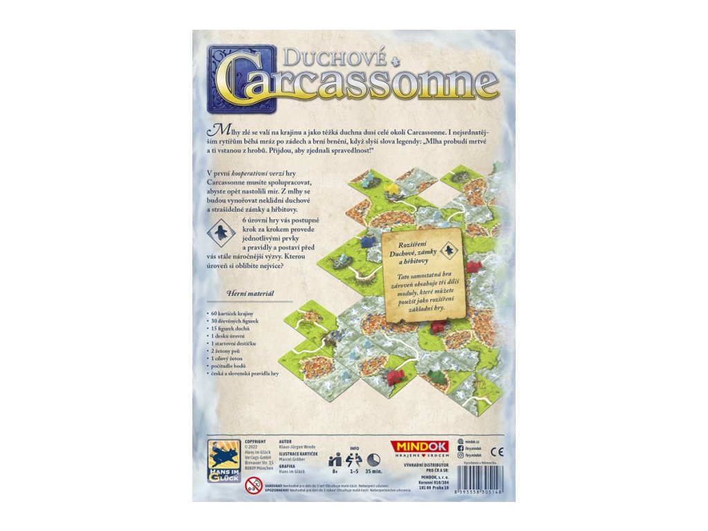Mlhy zlé se valí na krajinu a jako těžká duchna dusí celé okolí Carcassonne. I nejsrdnatějším rytířům běhá mráz po zádech a brní brnění, když slyší slova legendy: „Mlha probudí mrtvé a ti vstanou z hrobů. Přijdou, aby zjednali spravedlnost!“V první kooperativní verzi hry Carcassonne musíte spolupracovat, abyste opět nastolili mír. Z mlhy se budou vynořovat neklidní duchové a strašidelné zámky a hřbitovy.6 úrovní hry vás postupně krok za krokem provede jednotlivými prvky a pravidly a postaví před vás stále náročnější výzvy. Kterou úroveň si oblíbíte nejvíce?Hratelné také jako rozšíření základní hry Carcassonne! Věk 8+Doplňkové parametry