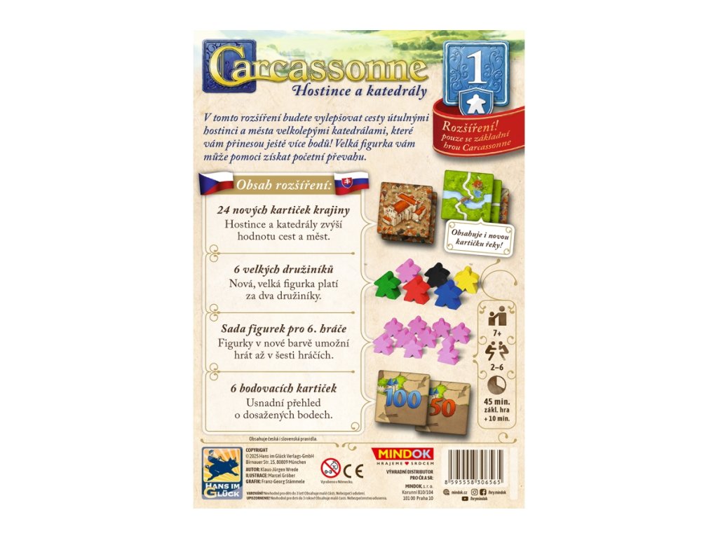 Vylepšete svou základní hru Carcassonne s rozšířením Hostince a katedrály, které přidává nové strategické prvky a vyšší bodové zisky. Budujte honosné hostince na cestách a velkolepé katedrály ve svých městech, abyste zdvojnásobili či ztrojnásobili své body. Navíc získejte velkého družiníka, který se počítá za dva a pomůže vám k získání početní převahy v klíčových oblastech. Určeno pro 2-6 hráčů. Věk 7+Doplňkové parametry