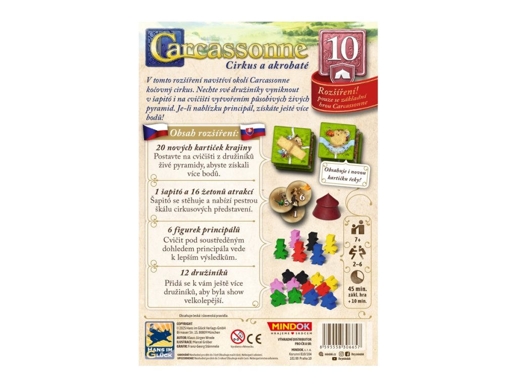 S rozšířením Cirkus a akrobaté dorazí do Carcassonne kočovný cirkus. Vytvářejte působivé pyramidy z akrobatů, sbírejte body za představení pod šapitó a využijte principála, který vám přinese extra body za blízká cvičiště a šapitó. Hra obsahuje tři moduly, které lze libovolně kombinovat. Určeno pro 2-6 hráčů. Věk 7+Doplňkové parametry
