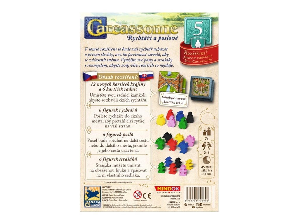 Rychtáři a poslové přináší do hry Carcassonne nové figurky s jedinečnými schopnostmi. Získejte přízeň šlechty s rychtářem, přemísťujte se s poslem a obsaďte lukrativní louky se strašáky. Strategicky umístěná radnice vám pomůže k vítězství, ale může také odvolat rychtáře, a proto si dobře rozmyslete, co uděláte. Určeno pro 2-6 hráčů. Věk 7+Doplňkové parametry