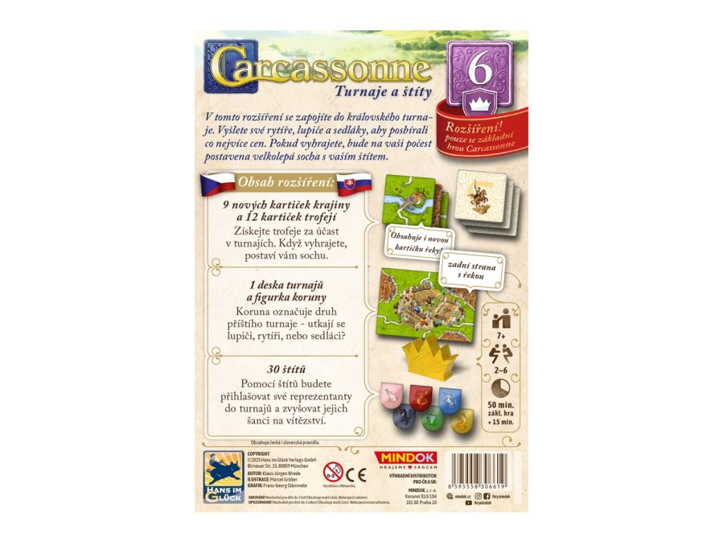 Zapojte se do královského turnaje v Carcassonne a vyšlete své družiníky do boje o slávu a trofeje. Vyzbrojte je štíty a strategicky je přihlašujte do turnaje. Vítězové si odnesou cenné trofeje a nechají si postavit sochu s vlastním štítem, který na konci hry přinese extra body! Toto rozšíření nelze hrát bez základní hry Carcassonne. Určeno pro -6 hráčů. Věk 7+Doplňkové parametry