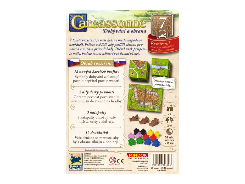 Braňte město Carcassonne před nepřáteli v novém rozšíření Dobývání a obrana. Vysílejte své lidi na hradby pevnosti, abyste získali body a ochránili své území před útoky. Dávejte si pozor na nové kartičky se symboly dobývání, které mohou spustit útoky na hradby a připravit vás o cenné figurky. Určeno pro 2-6 hráčů. Věk 7+Doplňkové parametry