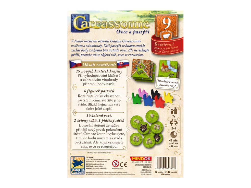 Deváté rozšíření Carcassonne: Ovce a pastýři přináší do hry pastýře, kteří shromažďují ovce na loukách a získávají za ně body. Musí se však mít na pozoru před vlkem, který může jejich stádo rozehnat. Získejte bonusové body za hejna hus a za vinohrady, které bodují s kláštery a zahradami. Určeno pro 2-6 hráčů, Věk 7+Doplňkové parametry