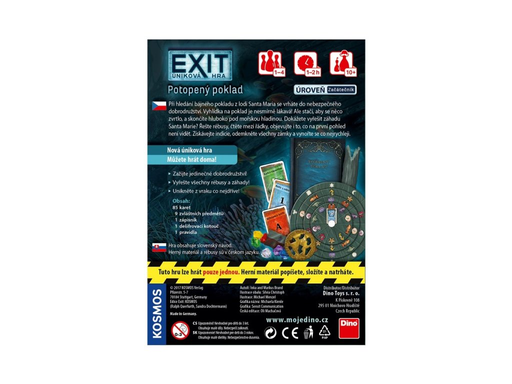 Čeká Vás skvělý herní zážitek! Potápění za pokladem může znít jako pohodové zpestření pobytu u moře, ovšem ne v únikové hře EXIT. Se svou plachetnicí a instruktorem se náhle ocitnete na moři uprostřed ničeho a námořní mapa, kterou jste si za pár dolarů koupili, je naprosto nepoužitelná. Ve snaze najít východisko objevujete jen samé rébusy a hádanky. Vyluštíte je dřív, než vám dojde vzduch? Najdete nakonec i poklad? Váš osud teď naprosto závisí jen na Vašich schopnostech spolupracovat a logicky myslet. Průběh hry Vám postupně odhalí kartičky s úkoly a rébusy, nápovědami a odpověďmi. Jestli se blížíte ke zdárnému cíli, Vám napoví speciální dešifrovací kotouč. Hra je vytvořena na jedno hraní pro 1 až 4 osoby.