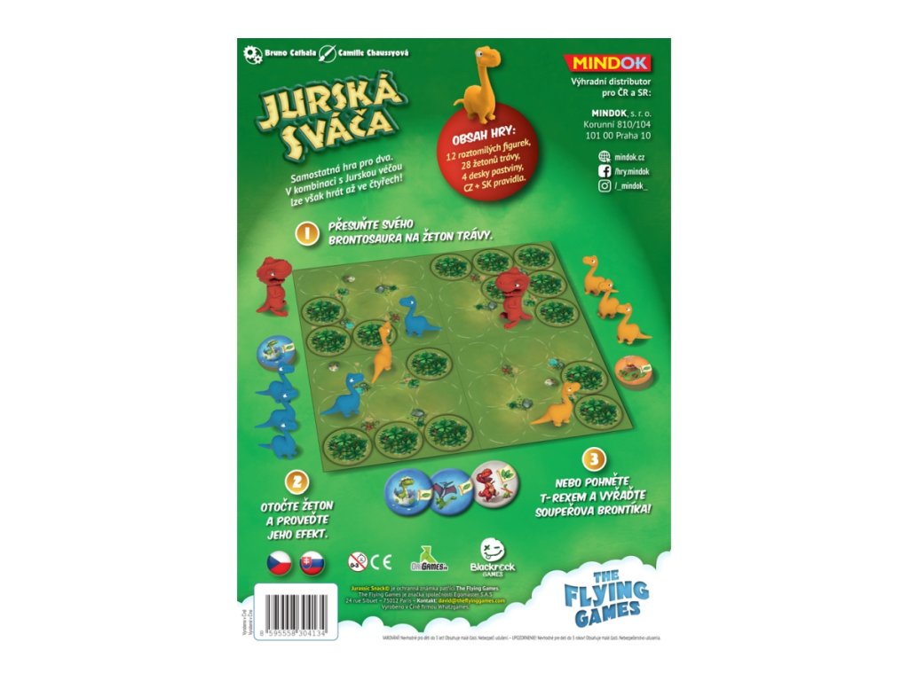 Mladí brontosauři ze všeho nejraději pojídají šťavnaté lístečky na pastvinách, kde bydlí. K vítězství musíte svým týmem brontíků sežrat více lístečků než soupeř – nebo povolat hrozivého T-rexe, aby soupeřovy brontíky zaplašil! Svižná poziční hra pro dva s roztomilými figurkami, která lze navíc zkombinovat s Jurskou véčou do týmové hry pro až 4 hráče! Věk 6+Doplňkové parametry