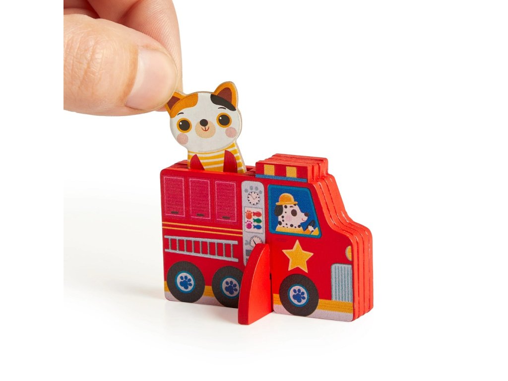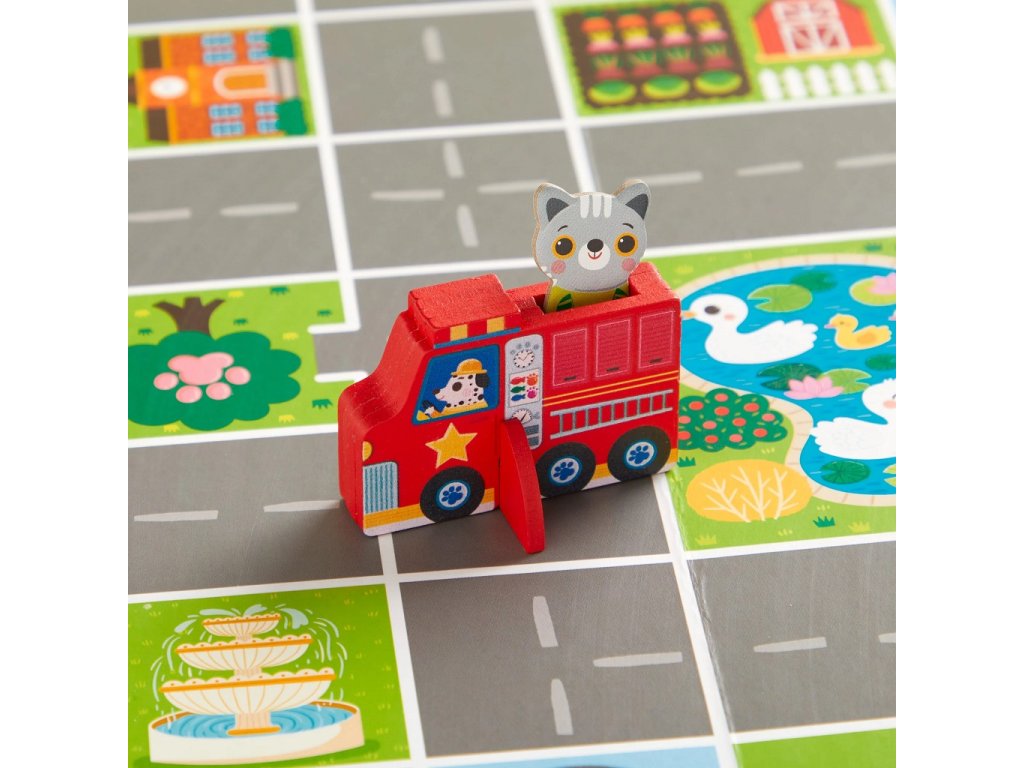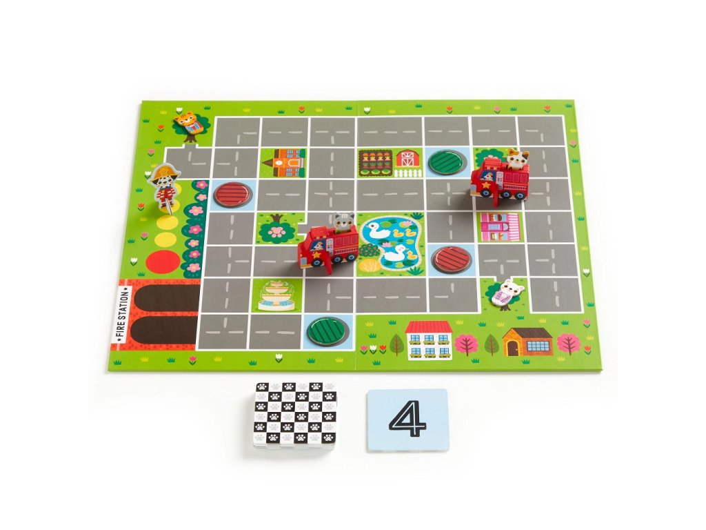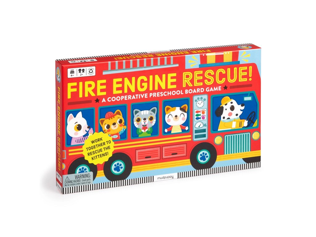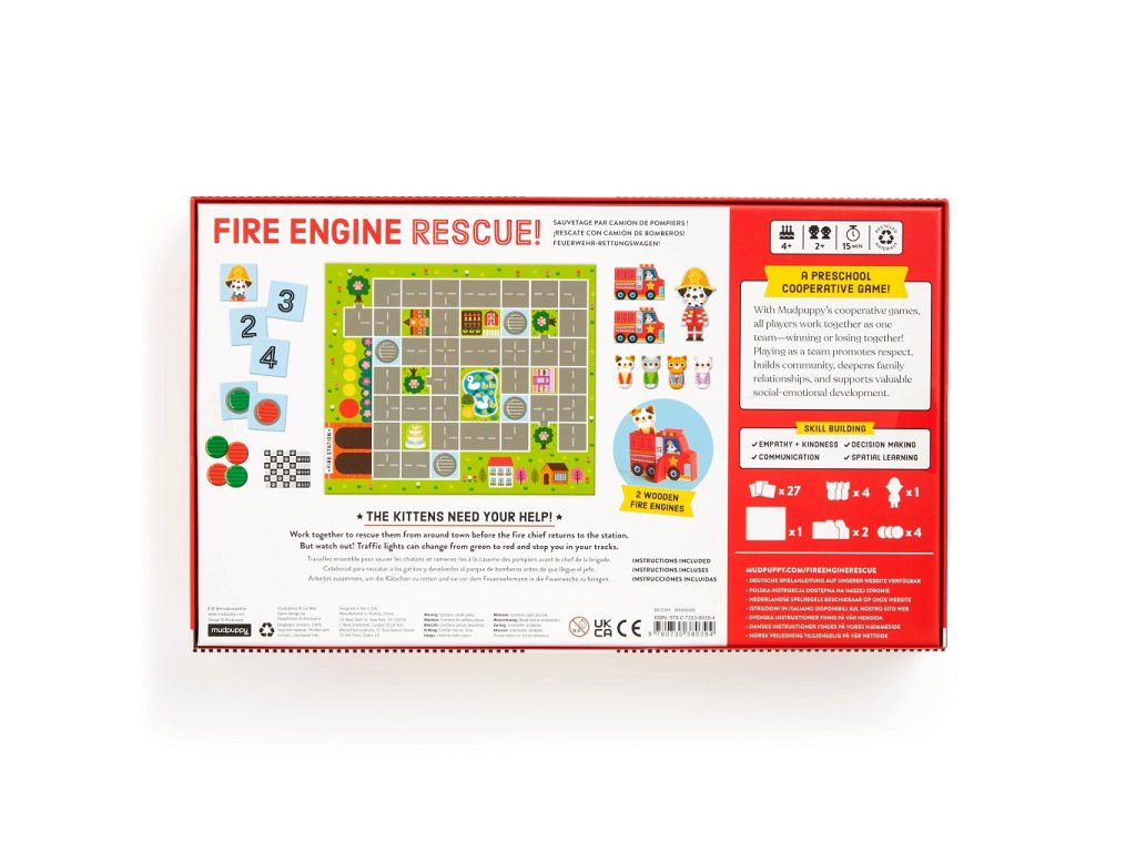 Představujeme Vám společenskou deskovou hru, při které se přenesete na záchrannou akci hasičů. Malá koťata uvízla na stromech a potřebují pomoc všech hráčů. Všichni spolupracují na jejich záchraně, než se velitel hasičů vrátí na stanici. Ale pozor, semafory na herním plánu se mohou změnit ze zelené na červenou a zastavit Vás. Hra obsahuje herní desku, 27 karet, 4 destičky semaforu, 4 destičky koťat, 2 dřevěné hasičské stříkačky a 1 stojícího velitele hasičů. Dřevěné hasičské vozy mají otvory, do kterých se koťátka zasouvají, když se vrací na stanici. Tato hra je ideální pro rodinnou zábavu. Děti se při hře naučí spolupracovat v týmu.