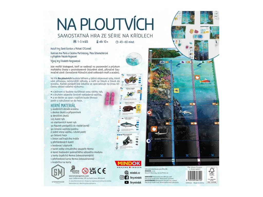 Strategická hra Na ploutvích pro 1-5 hráčů tě zavede do hlubin oceánů, kde se staneš mořským biologem. Tvým úkolem bude objevovat a zkoumat rozmanité druhy ryb, sbírat vajíčka, líhnout potěr a vytvářet hejna. Co tě pod hladinou čeká? Sbírání a vykládání karet ryb: Rozšiřuj svou sbírku karet s nádhernými ilustracemi ryb a získej za ně body na konci hry. Každá ryba má unikátní vlastnosti a efekty, které ti pomohou v tvém výzkumu. Prozkoumávání hlubin: Prováděj ponory do tří různých hlubokomořských zón – Osluněné, Soumračné a Půlnoční – a aktivuj speciální efekty karet ryb a zón. Kladení vajíček a líhnutí potěru: Sbírej žetony vajíček, líhni z nich potěr a vytvářej hejna, za které získáš další body. Plnění úkolů a požadavků: Každý týden plň speciální úkoly a získávej za ně bonusové body. Strategické rozhodování: Plánuj své tahy a efektivně využívej dostupné akce. Volba správné strategie je klíčem k vítězství. Sólo i skupinová hra: Zahraj si sólově proti autohráči, nebo se utkej s přáteli. Pro 1-5 hráčů. Věk 10+Doplňkové parametry