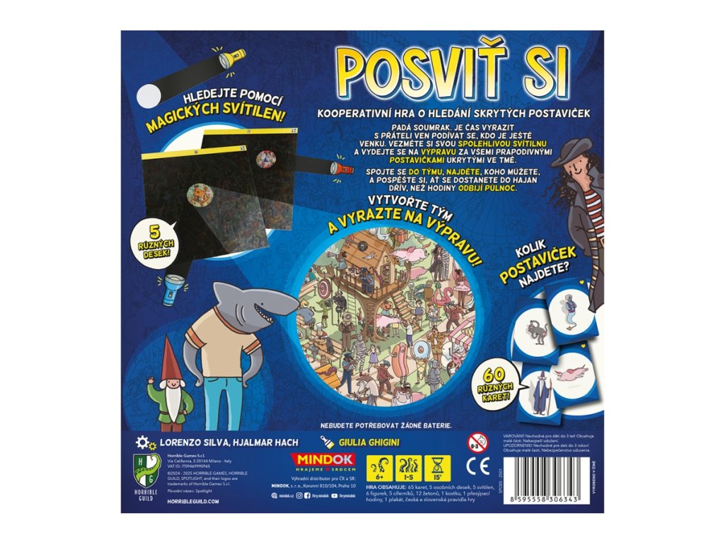 Posviť si je kooperativní hra, ve které se hráči vydávají na dobrodružný noční lov prapodivných postaviček. Vyzbrojeni svítilnami, hráči společně prohledávají temná zákoutí a snaží se odhalit všechny skryté bytosti dřív, než odbije půlnoc. Hra kombinuje prvky postřehu, spolupráce a časového tlaku, čímž vytváří napínavý a zábavný zážitek pro celou rodinu. Hráči mají za úkol prohledat herní desky pomocí speciálních svítilen a určit počet a umístění hledaných postaviček. Každé kolo hry přináší novou postavičku k nalezení, což zajišťuje variabilitu a neopakovatelnost každé partie. Důležitým prvkem je časový limit, který je odměřován přesýpacími hodinami nebo aplikací, což nutí hráče k rychlému a efektivnímu hledání. 1-5 hráčů, věk 6+Doplňkové parametry