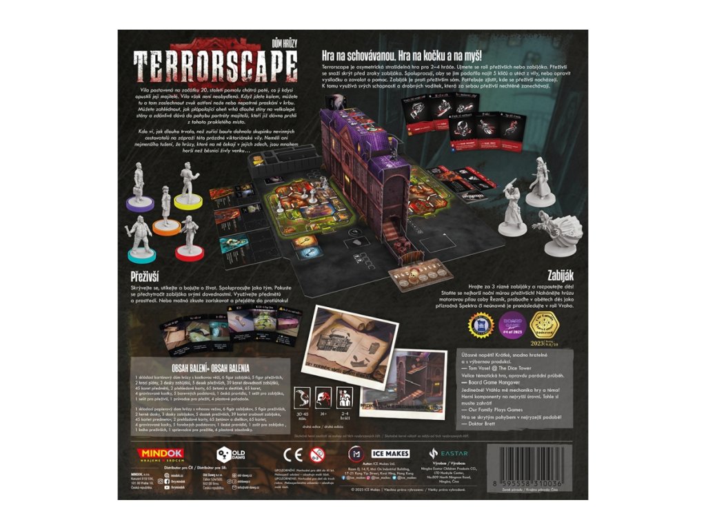 Vstupte do noční můry v asymetrické hororové hře Terrorscape, kde jeden z vás je krvežíznivý zabiják a ostatní zoufale bojují o přežití. Přeživší se musí skrývat, hledat předměty a pokusit se uniknout nalezením pěti klíčů nebo opravením vysílačky, přičemž každý neopatrný krok vytvoří hluk, který zabijákovi pomůže je najít. Podaří se vám přelstít lovce, nebo se stanete jeho další obětí? Určeno pro 2-4 hráče. Věk 14+Doplňkové parametry