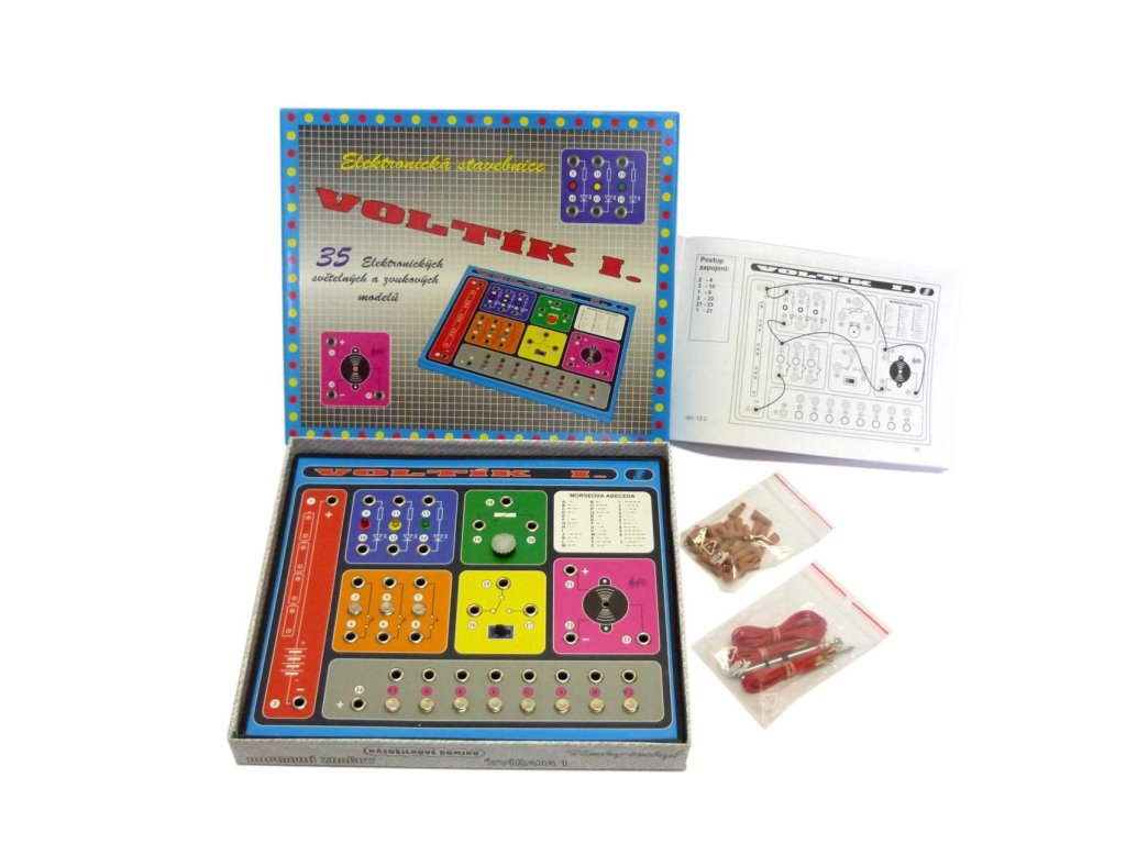 Stavebnice VOLTÍK I. je určena dětem od 6 let a umožňuje sestavit podle jednoduchých návodů nejméně 35 elektronických modelů bez pájení s barevnými světélky a tónovým bzučákem. Nevyžaduje žádné znalosti elektroniky! Modely mají různou obtížnost sestavení, od nejjednodušších, například světelný a zvonkový obvod, různé houkačky, až po měřič vlhkosti, vysílač a přijímač Morseovy abecedy, elektronický klavírek či telegraf. Napájení: 4×AA baterie (nejsou obsahem balení).Upozornění: Dětem do 8 let určeno pouze pod dohledem rodičů.