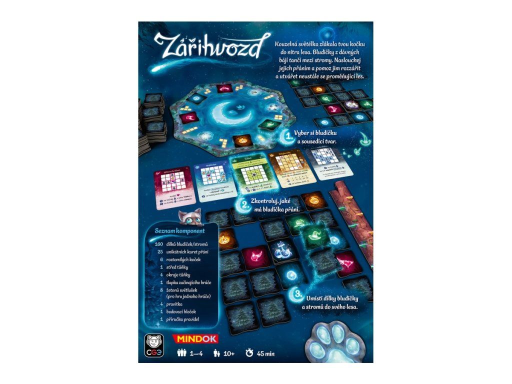 Vstupte do Zářihvozdu, budujte svůj les v rostoucí mřížce a strategicky umisťujte Bludičky a stromy tak, abyste splnili jejich specifická přání. Využijte speciální schopnosti své Kočky k manipulaci s nabídkou dílků a k získání těch nejlepších tvarů. Tato abstraktní strategická hra s krásnými ilustracemi trvá 3 kola a vyžaduje pečlivé plánování a adaptaci na stále se měnící podmínky bodování. Určeno po 1-4 hráček. Věk 10+Doplňkové parametry