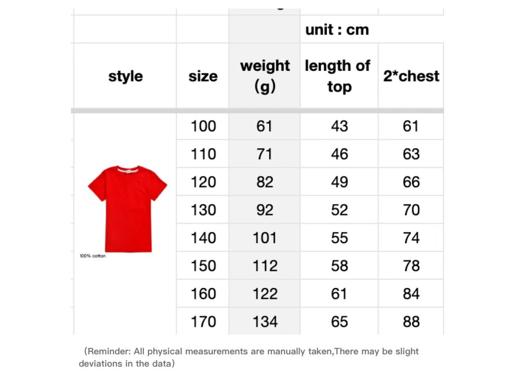| Velikost | Váha trička (g) | Délka trička (cm) | Obvod hrudníku (cm) |