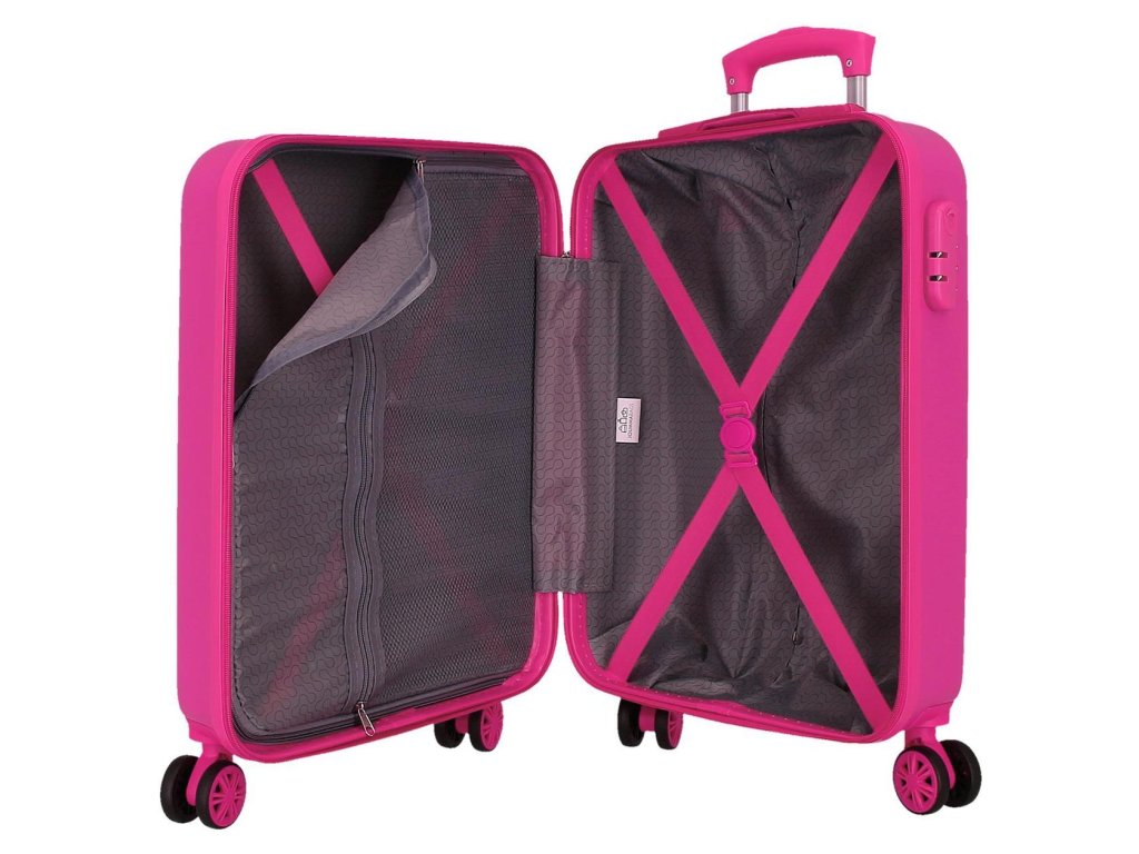 JOUMMABAGS Dětský skořepinový kufr s motivem Disney Minnie, 55 cm. Materiál: ABS plast, kvalitní skořepinový obal, odolný proti nárazům a poškození vnitřního obsahu kufru. Rozměry: 55x38x20 cm. Parametry: 4 dvojitá kolečka s rotací 360° pro pohodlné řízení. Výsuvná rukojeť. Uvnitř praktické dělení na 2 části, každá s pružnými popruhy. Integrovaný zámek s číselným kódem Rozměr umožňuje použití též jako kabinové zavazadlo u většiny leteckých společností. Objem 34 l. Hmotnost: 2,6 kg Výrobce: Joummabags Pol. Ind.Lágrillend 46870 Ontinyent, Spain joumma@joumma.comDoplňkové parametry