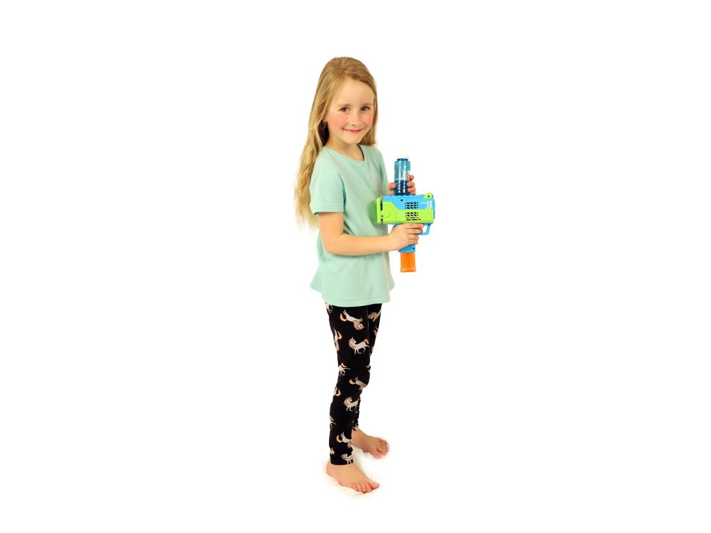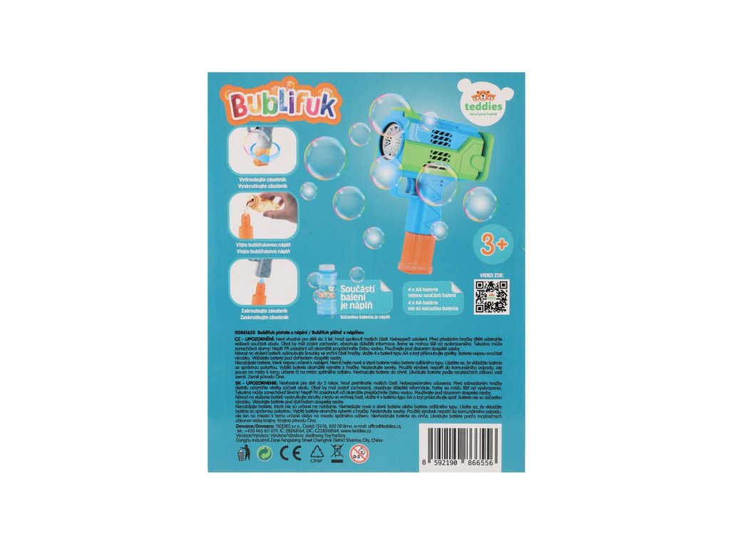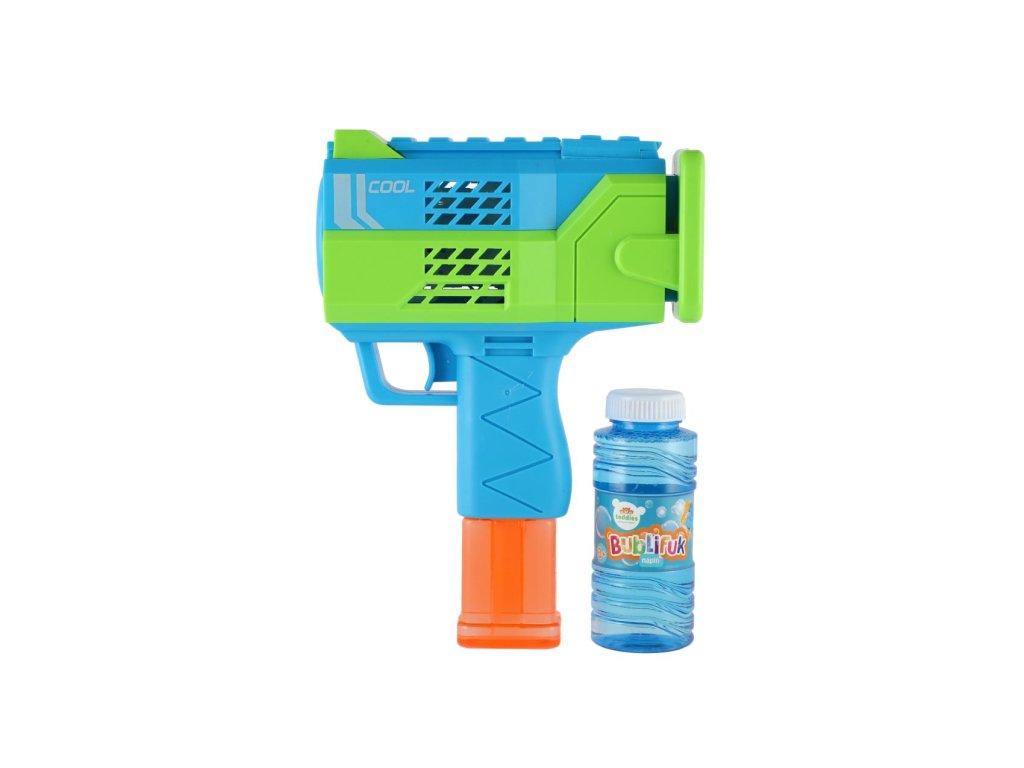 Nebaví Vaše děti foukat bubliny po jedné? V tom případě je tato pistole přímo pro vás. Odjistěte, nalijte náplň do nádoby, stiskněte spoušť a užívejte si duhový ráj bublin. Nekonečná zábava pro děti i dospělé, bublifuk bude báječná legrace nejen na teplé letní dny. Bubliny jsou jako kouzelné balonky, které si dítě může vykouzlit a obdivovat jejich duhovou barvu. Bublifuk pistole s náplní.Rozměry balení 18 x 23 x 8 cm.