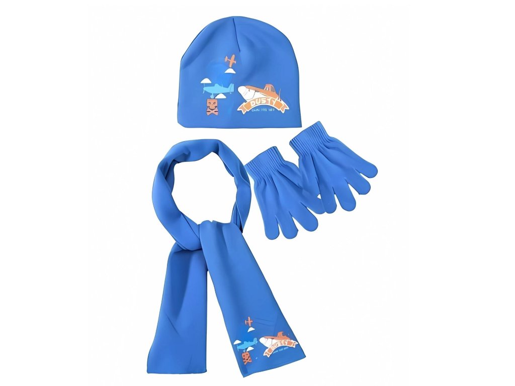 V provedení modrá. Souprava šála, čepice a rukavice Disney Planes. 100% acrylyc. Oficiální licence, Sun City, Francie.Doplňkové parametry