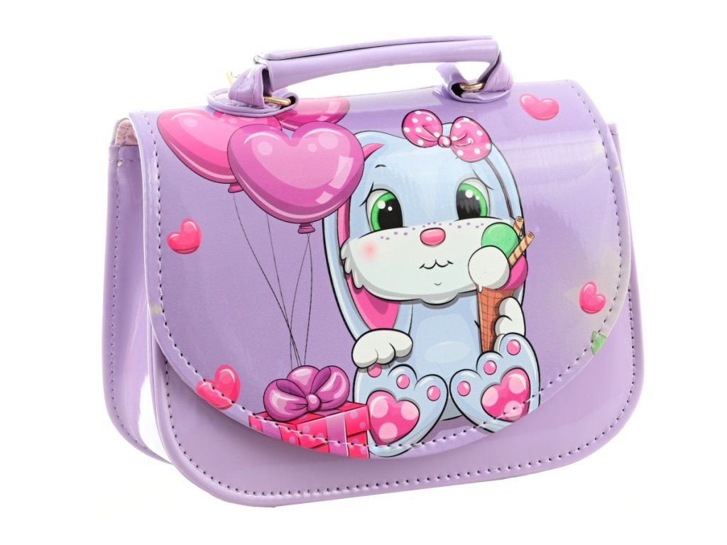 Kabelka s motivem králíčka se srdíčky. Lesklý materiál. Jedna kapsa, zapínání na druk. Rozměry kabelky 18x14x7 cm. Výrobek není hračka.Doplňkové parametry