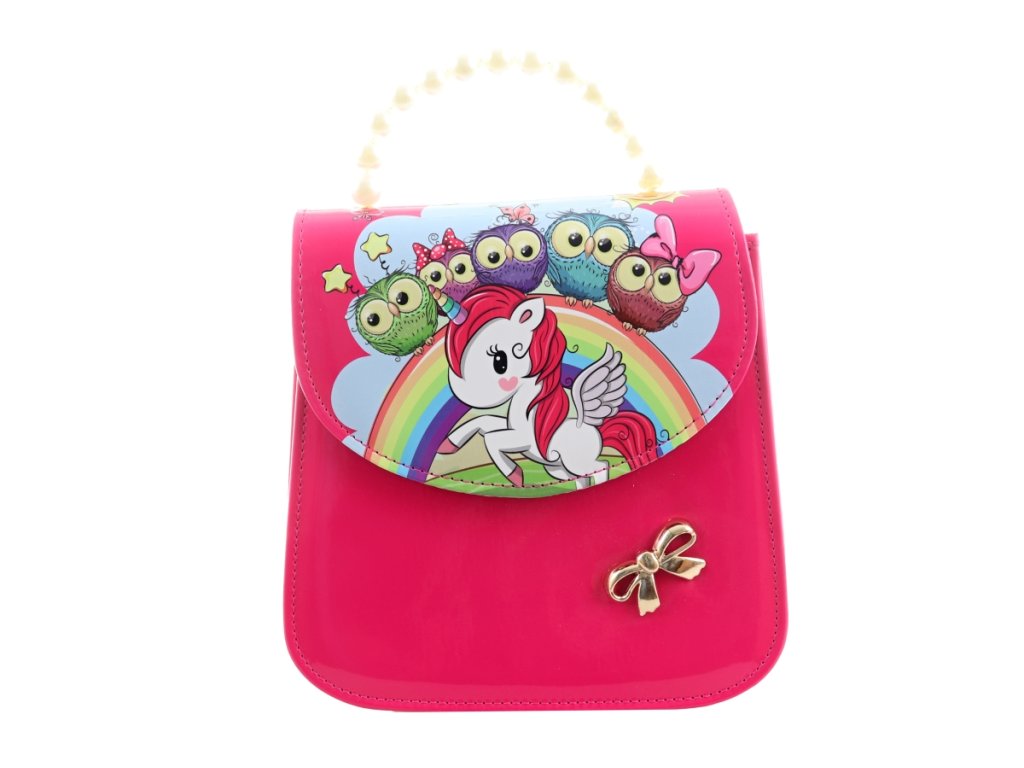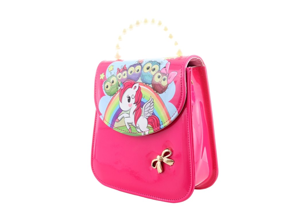 Kabelka s motivem jednorožce. Lesklý materiál. Lze nosit v ruce nebo přes rameno. Zapínání na druk - kabelka má jednu velkou kapsu. Rozměry kabelky 20x21x5,5 cm. Výrobek není hračka.Doplňkové parametry