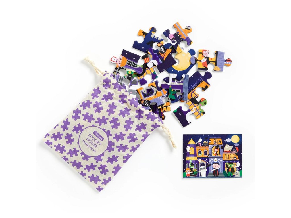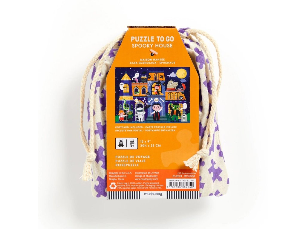 Puzzle se skládá z 36 dílků, které do po složení vytvářejí barevně strašidelný obraz vašich oblíbených halloweenských příšerek shromážděných před strašidelným sídlem a vyžívajících se ve strašení. 36dílné puzzle je zabaleno v cestovní 100% bavlněné tašce se stahovací šňůrkou. Skládat puzzle na cestách nikdy nebylo tak snadné! Spolu s pečlivě zabalenými dílky naleznete v balení také letáček s návodným obrázkem, který zpravidla obsahuje další informace o tvůrcích a pozadí vzniku díla.