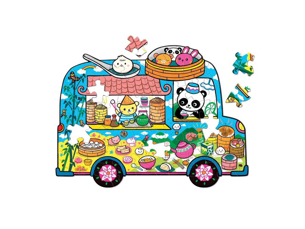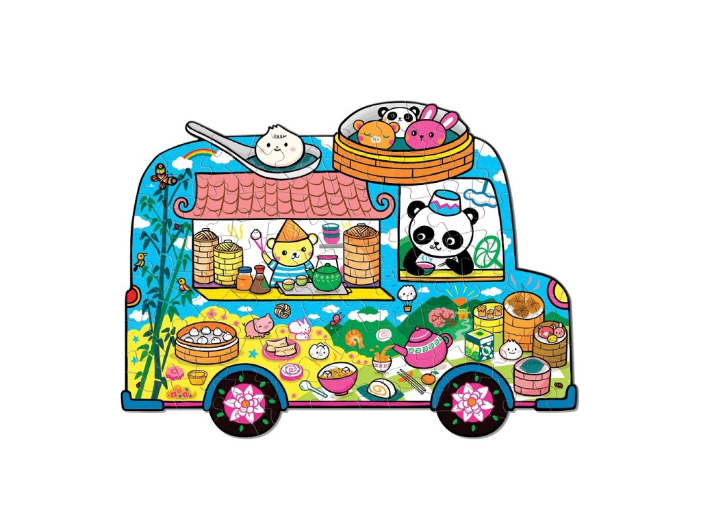 Puzzle obsahuje 75 dílků, složený obrázek má tvar minibusu s občerstvenímObrázek ilustrovala tchajwanská umělkyně Belinda Chen