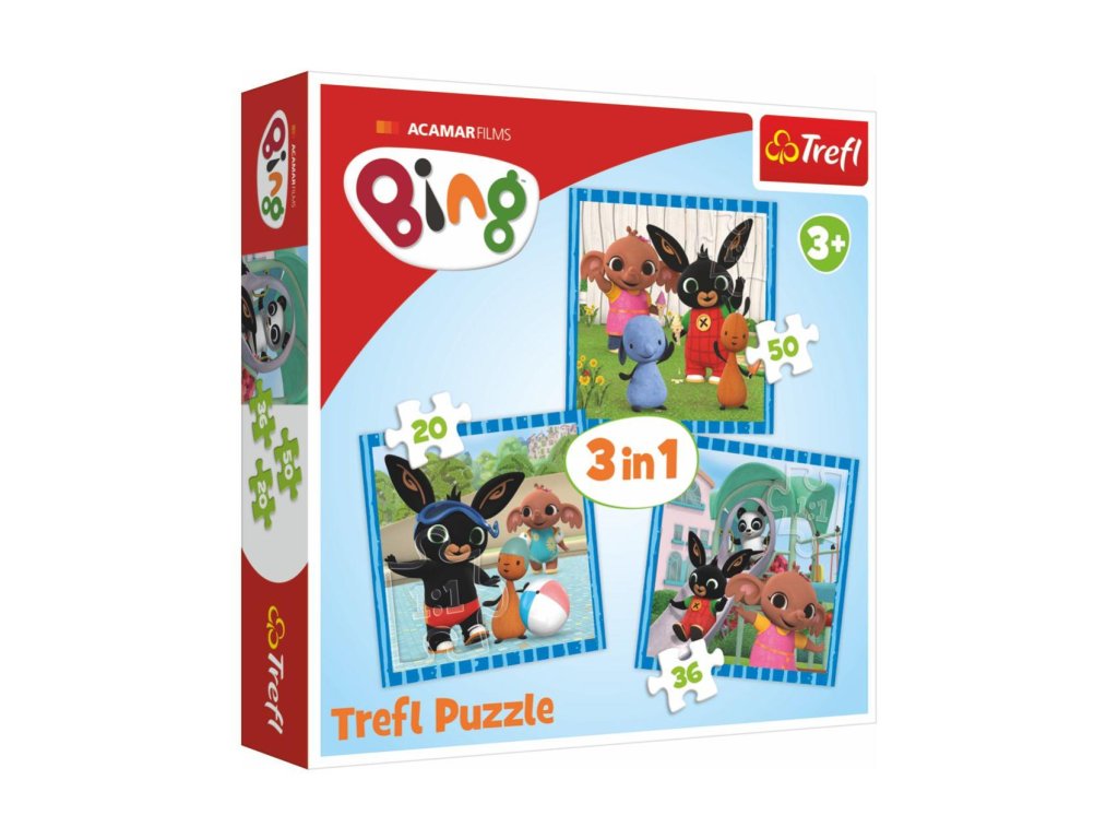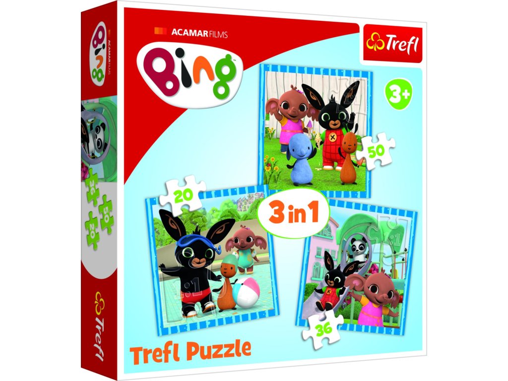 Puzzle s motivem oblíbeného seriálu Bing. Tři samostatná puzzle s různým počtem dílků - 50, 20 a 36 - postupně vedou ke zdokonalování dítěte při skládání a zvyšování obtížnosti.Rozměry balení 28 x 28 x 6 cm.