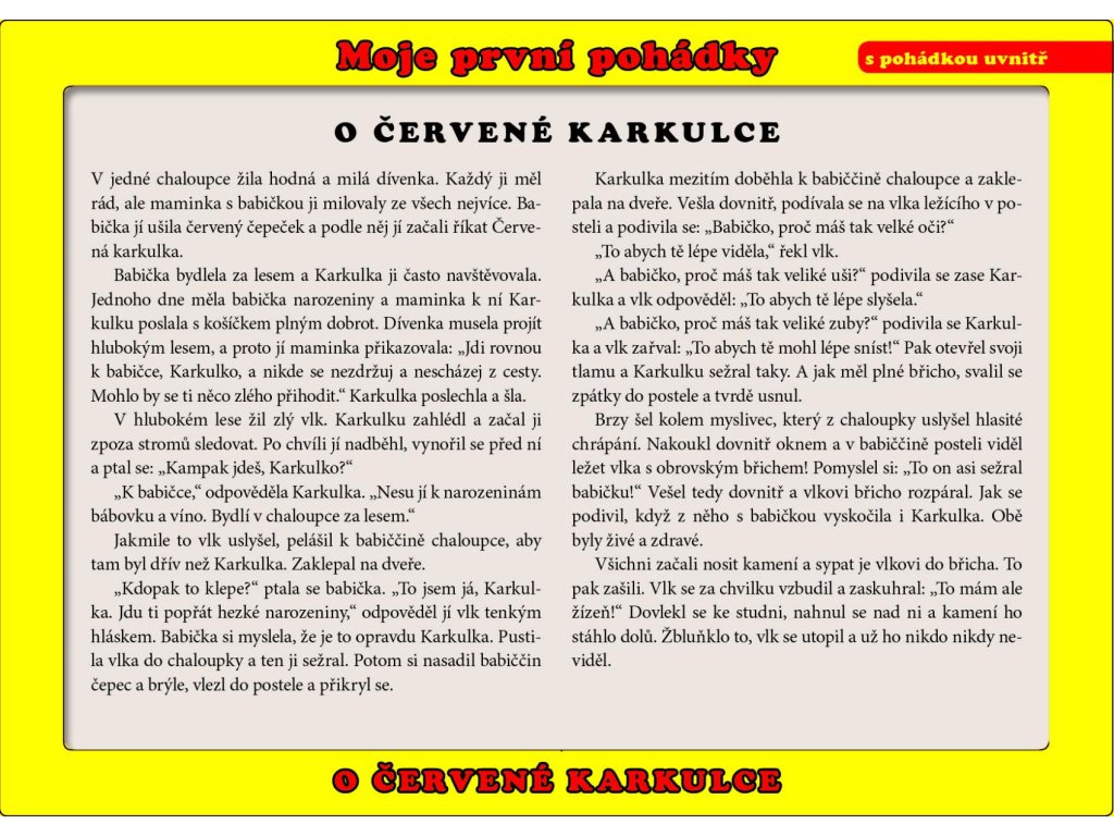 Deskové puzzle O Červené Karkulce je perfektním spojením pohádky a stavění puzzle, které děti milují. Pod sestaveným obrázkem s motivem tradiční české pohádky ji najdete psanou.Rozměr puzzle: 26 x 17 cm, 24 dílků