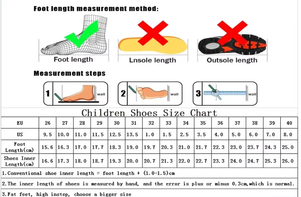 Poznámka: K délce nohy se doporučuje připočíst tzv. nadměrek 1-1,5 cm. Doporučujeme stélku změřit nebo vzít o číslo větší, než běžně potomek nosí. Ideálně vyndat vložku z bot, a tu přeměřit. Nebo můžete nožičku přiložit k rovné zdi, změřit po paleček a k této délce připočíst 1-1,5 cm. Čínské velikosti jsou o něco menší než v Evropě.