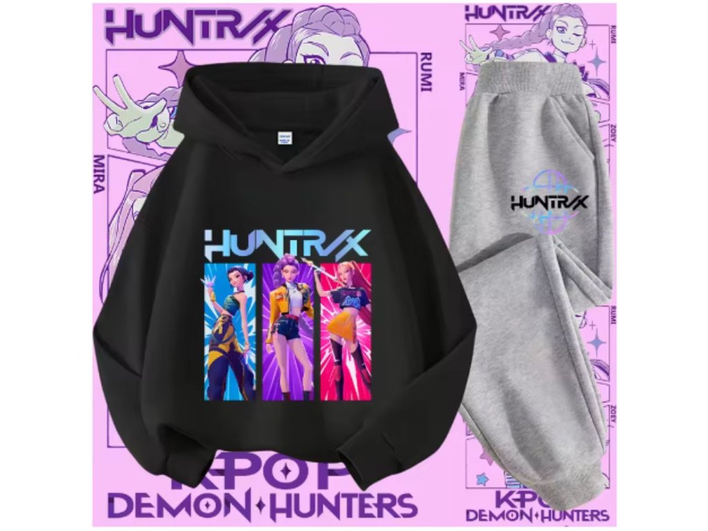 Tepláková souprava KPop Demon Hunters (Huntrix), černá mikina + černé/šedé kalhoty (SKLAD)