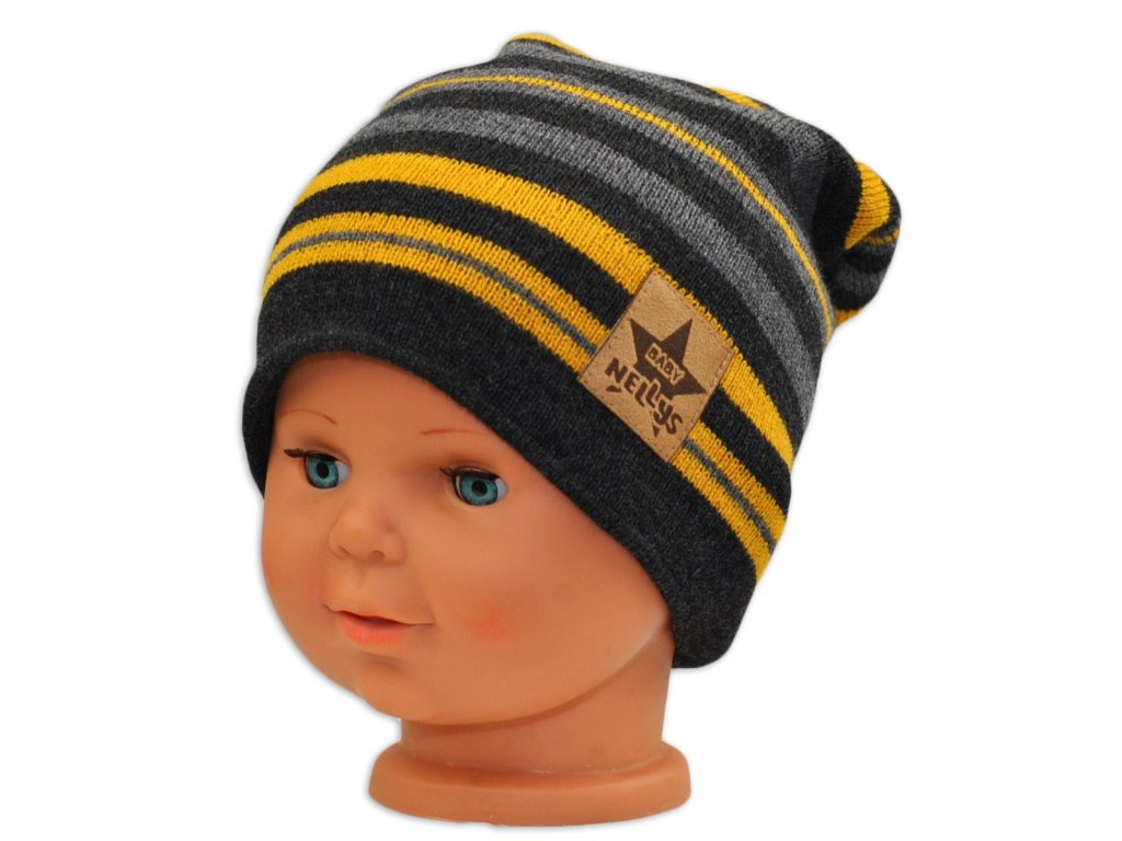 BABY NELLYS Jarní/podzimní proužkovaná čepice -grafit/šedá/žlutá