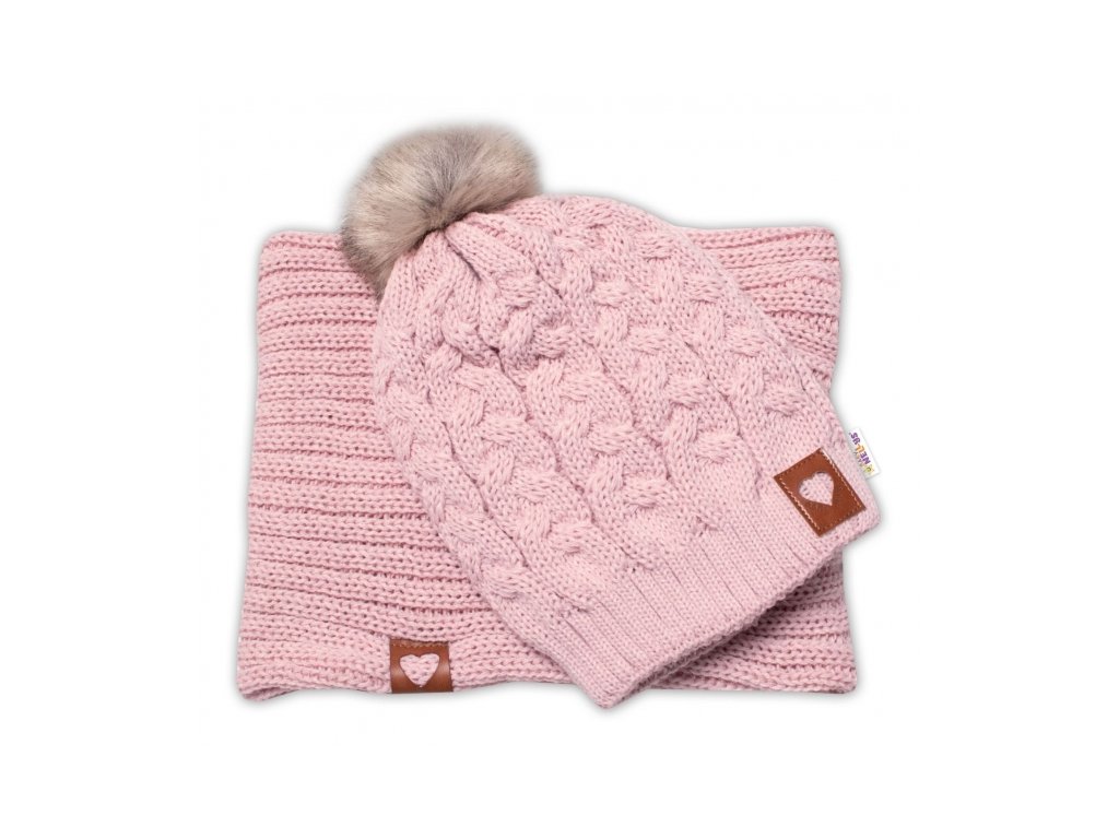 BABY NELLYS Zimní pletená čepice s bambulí + komínek, starorůžová