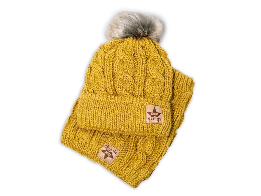 BABY NELLYS Zimní pletená čepice s bambulí + komínek, hořčice
