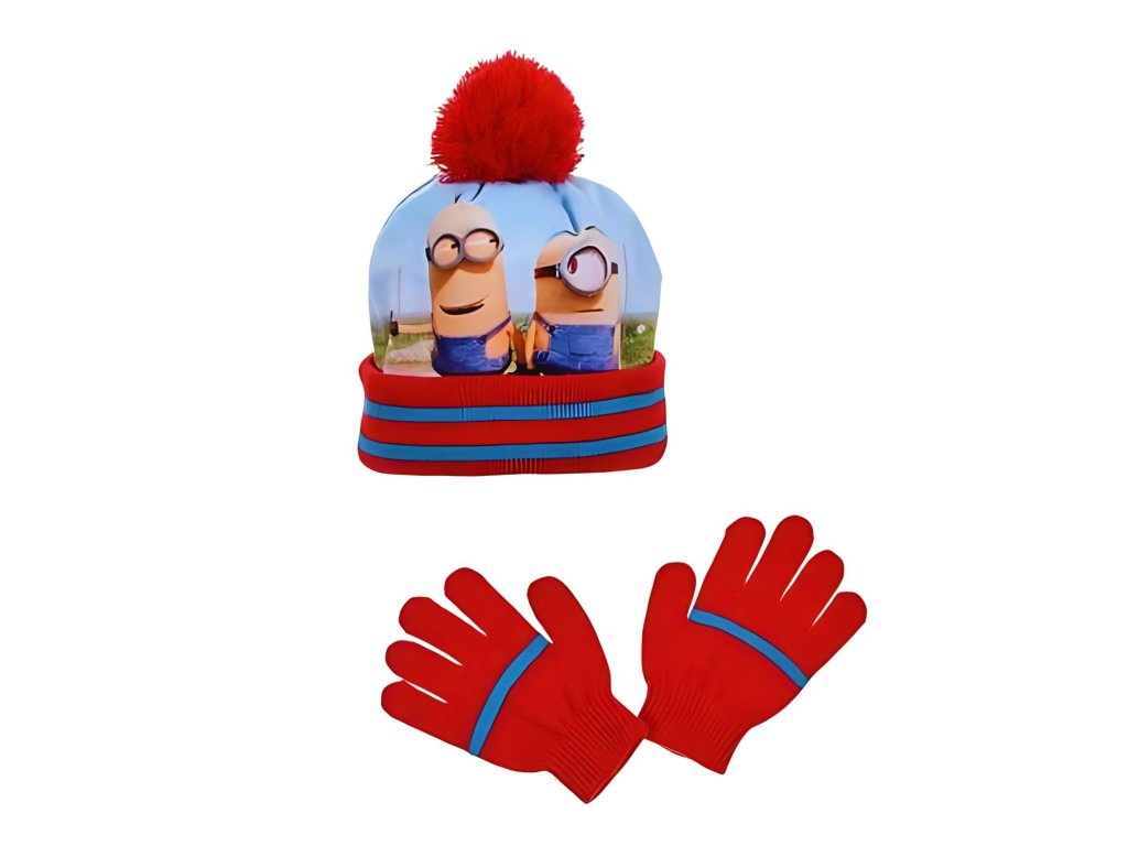 V provedení červená. Čepice a rukavice Mimoni. Svrchní materiál: samet, 100% polyester. S flísovou podšívkou, 100% polyester. Rukavice 100% acrylyc. Oficiální licence.Doplňkové parametry