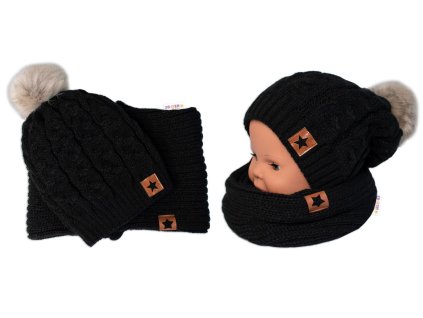 BABY NELLYS Zimní dvouvrstvá čepice s bambulí + komínek Star, černá