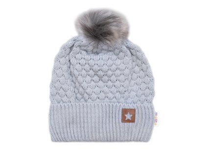 Zimní pletená čepice Star s fleecem a chlupáčkové bambulky+komínek 2D sada, šedý melírek
