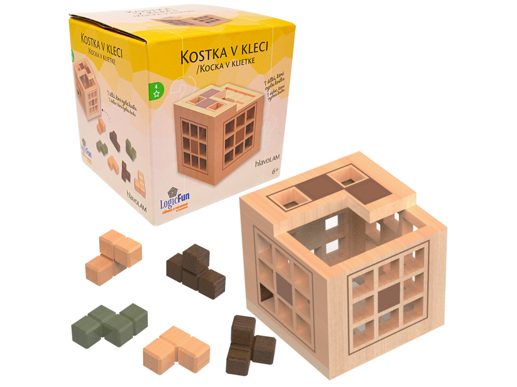 Hlavolam se skládá ze 7 dřevěných bloků, které je třeba poskládat do tvaru kostky a poté umístit do dřevěné klece. Tato zajímavá hračka podporuje logické myšlení a pomáhá dětem učit se prostřednictvím zábavy. Elegantní dřevěné provedení dává pocit přírodního materiálu a je příjemné na dotyk.