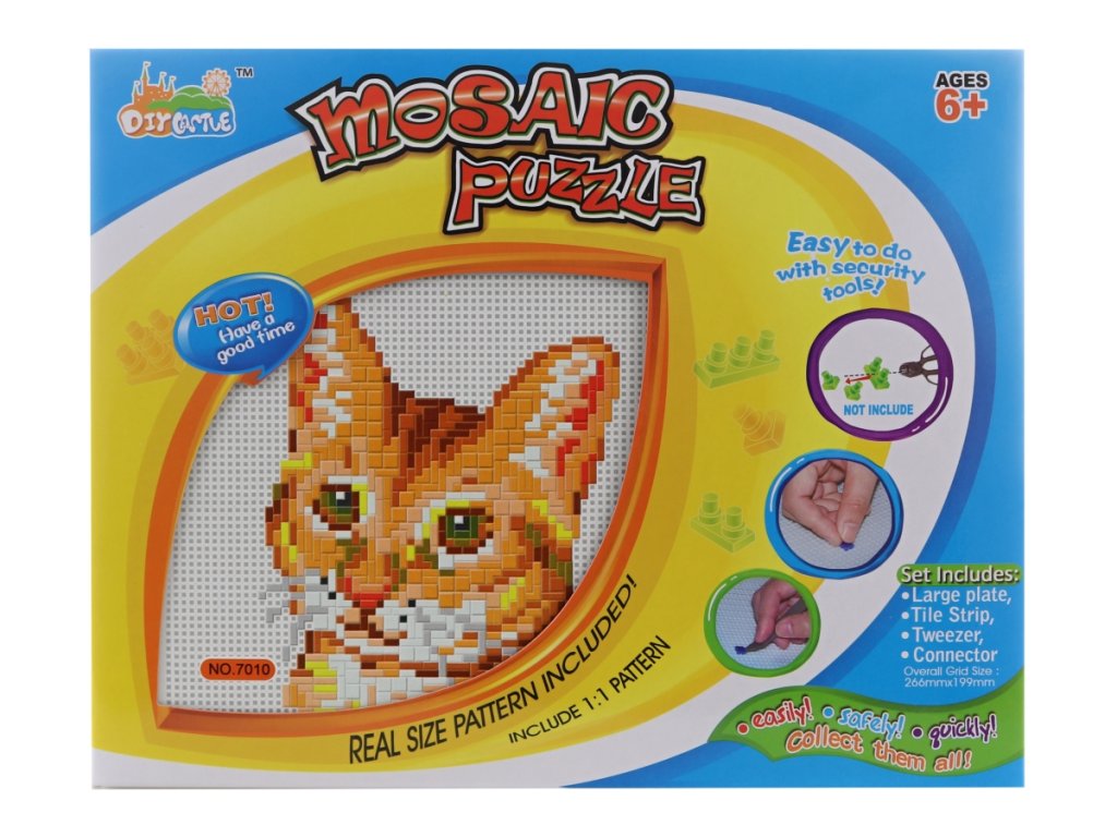 Mozaika s motivem kočky. Balení obsahuje základnu pro stavění obrázku, pinzetu a 2 háčky pro zavěšení hotového obrázku. Materiál plast. Rozměry základny 26,6x19,9 cm. Rozměry balení 30x23,5x4 cm. Věk 3+ (doporučeno od 6i let)Doplňkové parametry
