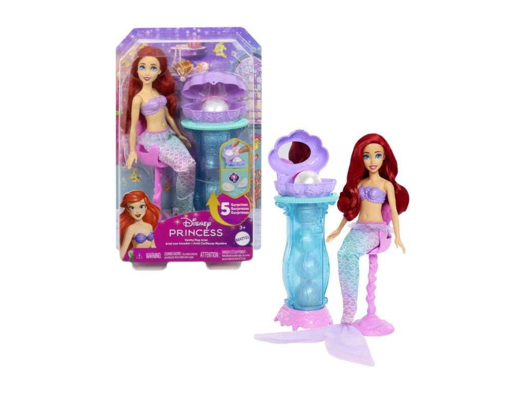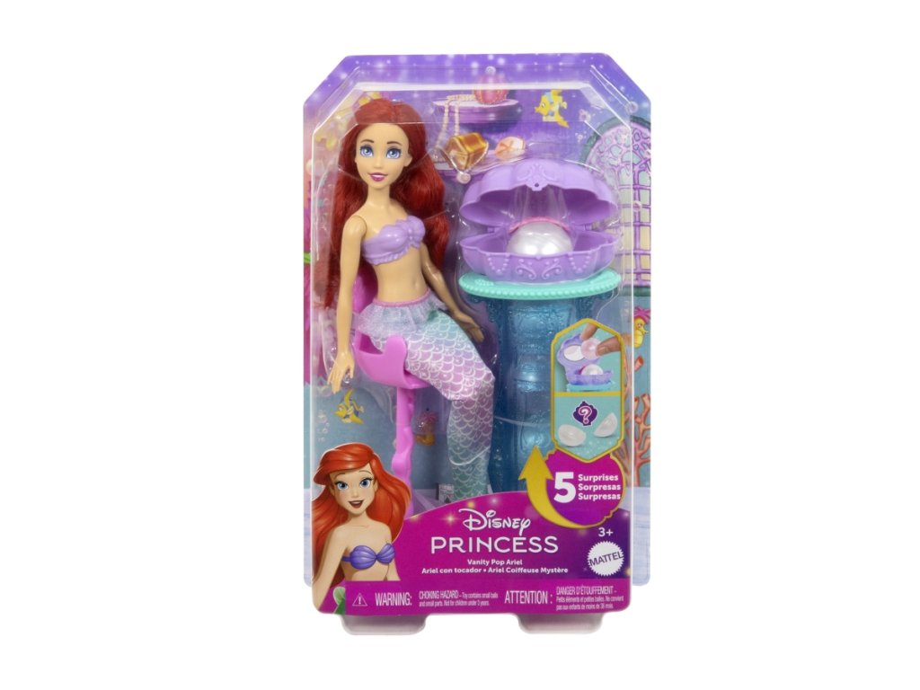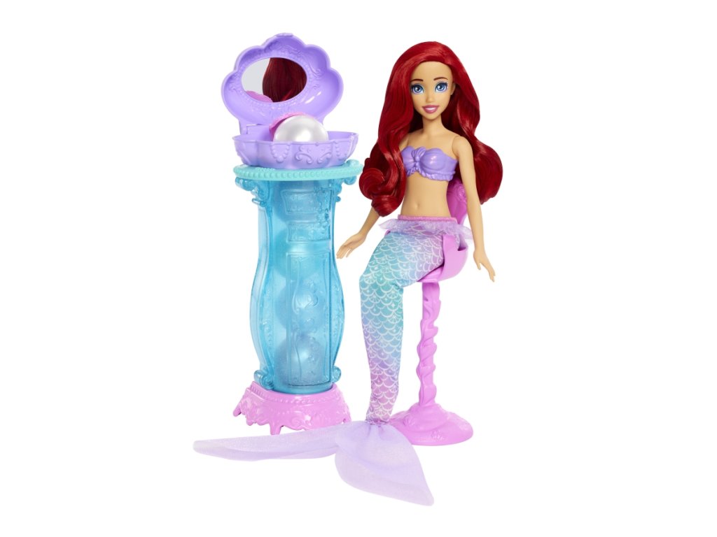 Herní set panenka Ariel s toaletním stolkem je připravena na dobrodružství se skrytými překvapeními a opakovatelnou hrou! Otevřete stolek a vynoří se perla s překvapivým doplňkem - celkem je jich 5! Perly lze do toaletního stolku znovu vložit a hrát si s nimi donekonečna. Set obsahuje módní panenku Ariel s odnímatelným ocasem z měkkého materiálu v novém třpytivém vzhledu. Barvy a vzhled výrobku se mohou lišit. Věk 3+Doplňkové parametry
