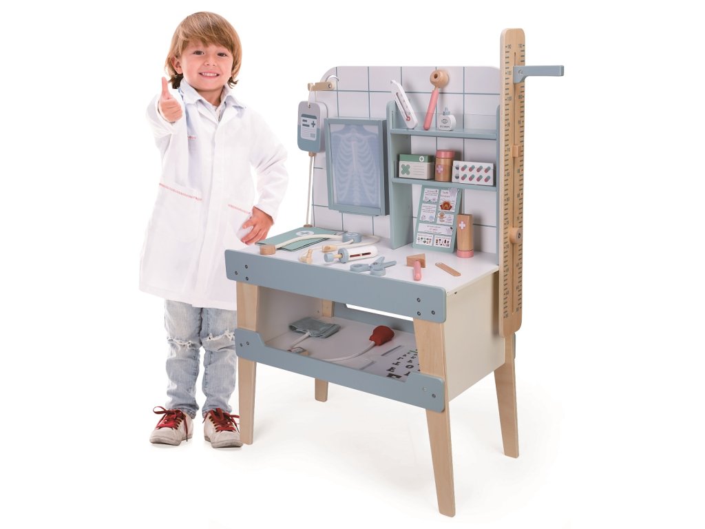 Znáte výšku svého pacienta? Ne? Pak ho změřte! Změřte mu i tlak nebo teplotu, poslechněte si ho a vše důkladně zapište do karty pacienta. Můžete také zkontrolovat zrak či sluch a nezapomeňte se podívat na rentgenové snímky na funkční podsvícené desce! Sada obsahuje stůl pro vyšetření a zákroky s úložným prostorem a nástroje nezbytné pro práci lékaře. Stetoskop, tlakoměr, teploměr, pinzetu, krabičky na léky a krémy, nůžky, infúzi, 4 RTG snímky, otoskop, injekční stříkačku, kladívko, karty pacientů, kartičky s léky, tabulku pro kontrolu zraku a informativní letáčky.