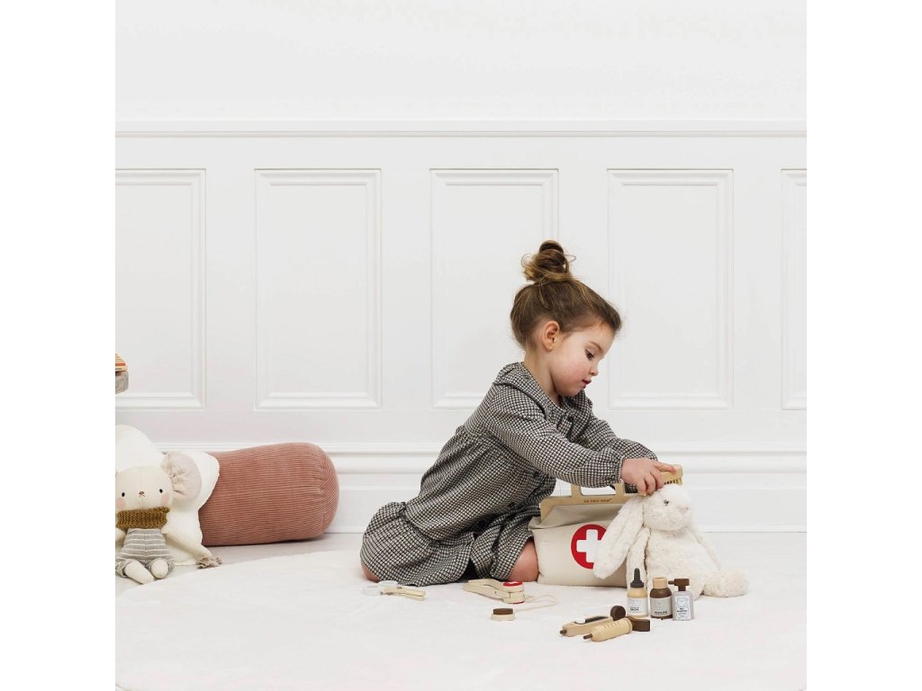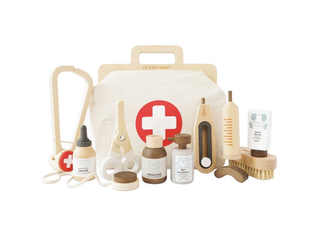 Představujeme Vám sadu pro malé veterináře. Obsahuje veterinární tašku ve stylu vintage, která je vybavena všemi potřebnými nástroji, aby se každému zvířecímu pacientovi dostalo té nejlepší péče. V brašně najdete zklidňující balzám na tlapky, ušní kapky, krabičku na léky, šampon pro domácí mazlíčky, stetoskop, nůžky, injekční stříkačku a měkký kartáček s ekologickými štětinami. Všechny doplňky jsou z mořeného přírodního dřeva s certifikací FSC.
